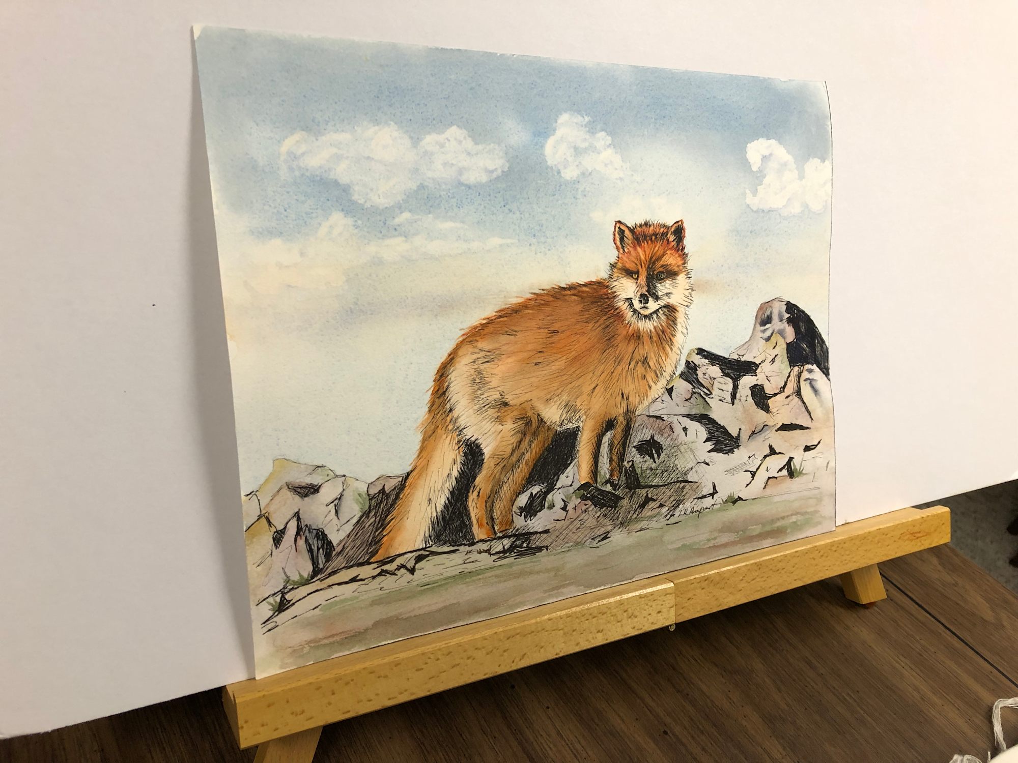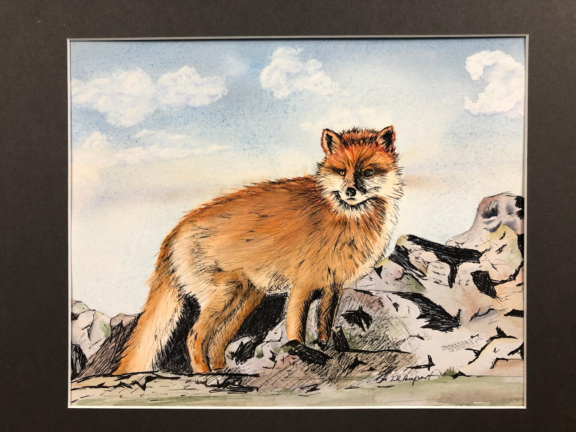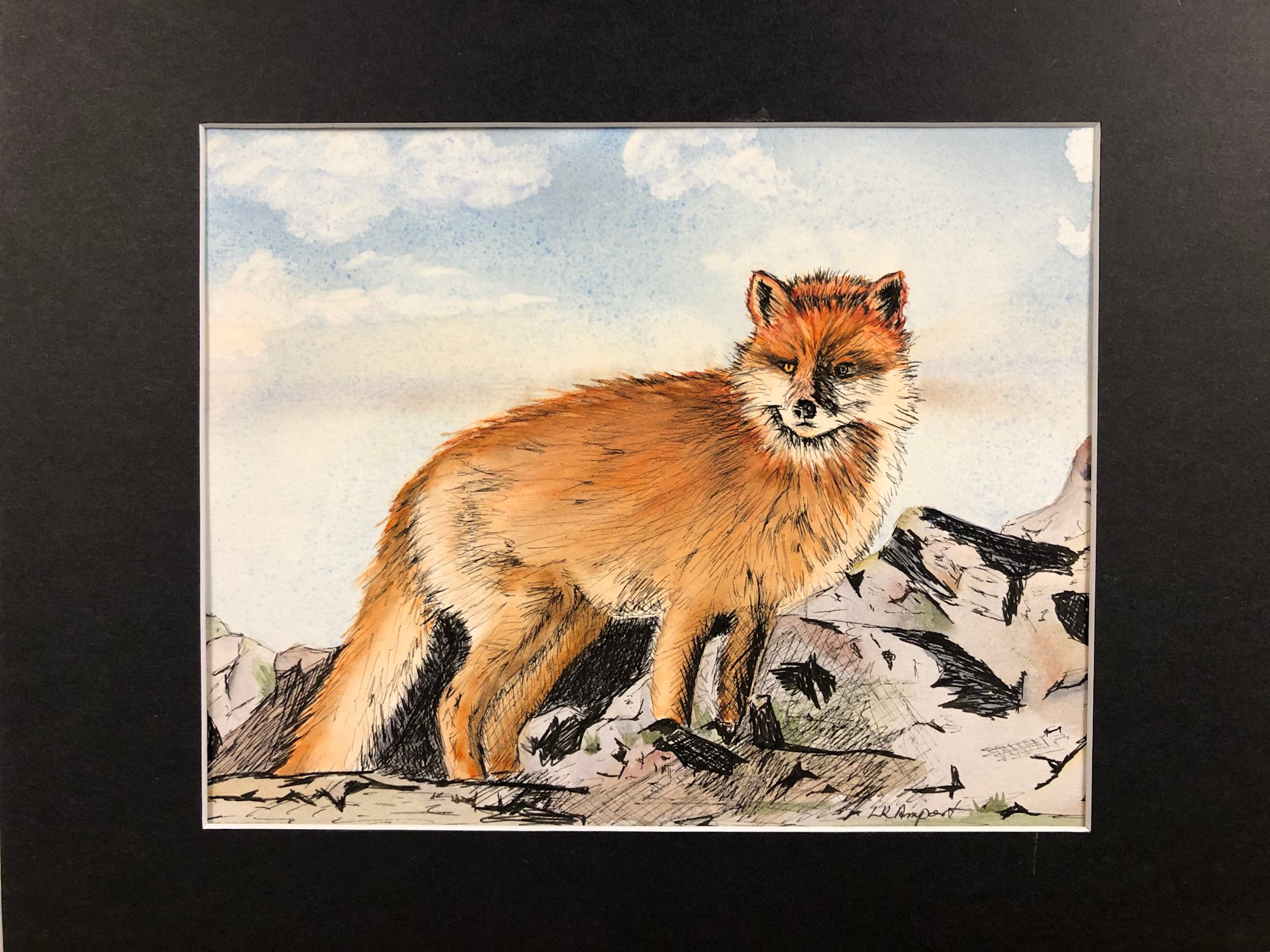 This ink and watercolor fox creation catches a fox interested in something in the distance.