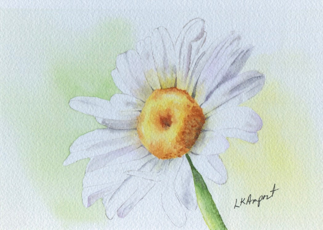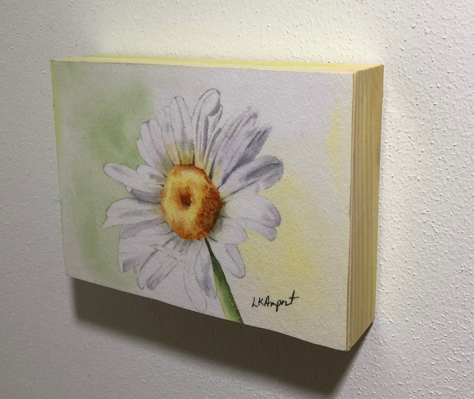 This Watercolor on paper has been coated with a protective varnish. It is bonded onto a 1.5 inch deep wood cradle with the sides tinted yellow/green, wired on the back and "Ready to Hang".