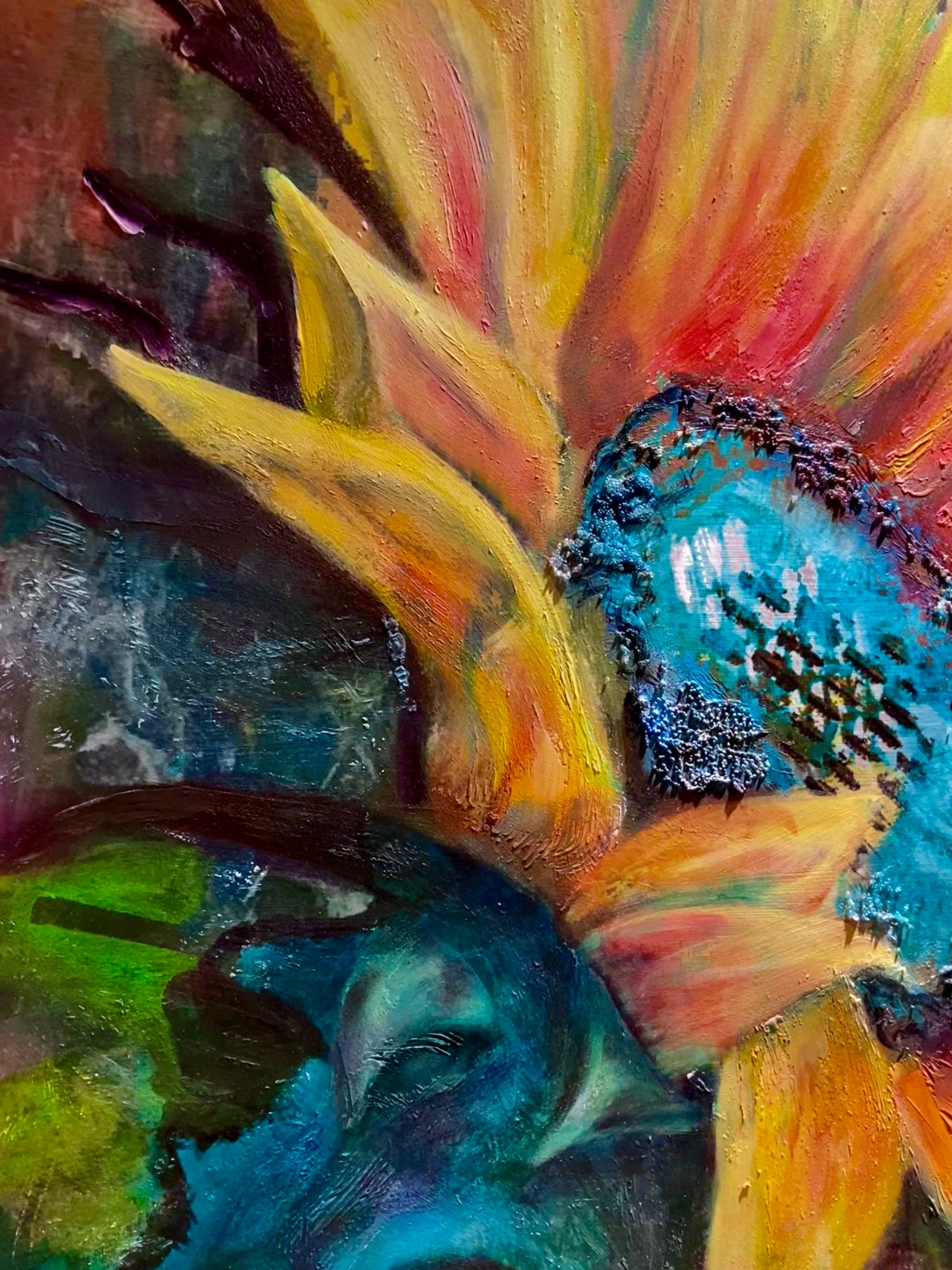 Painted and drawn digitally, printed on brushed aluminium, gessoed and painted with oils and waxes as the final layers of strength, courage and hope.