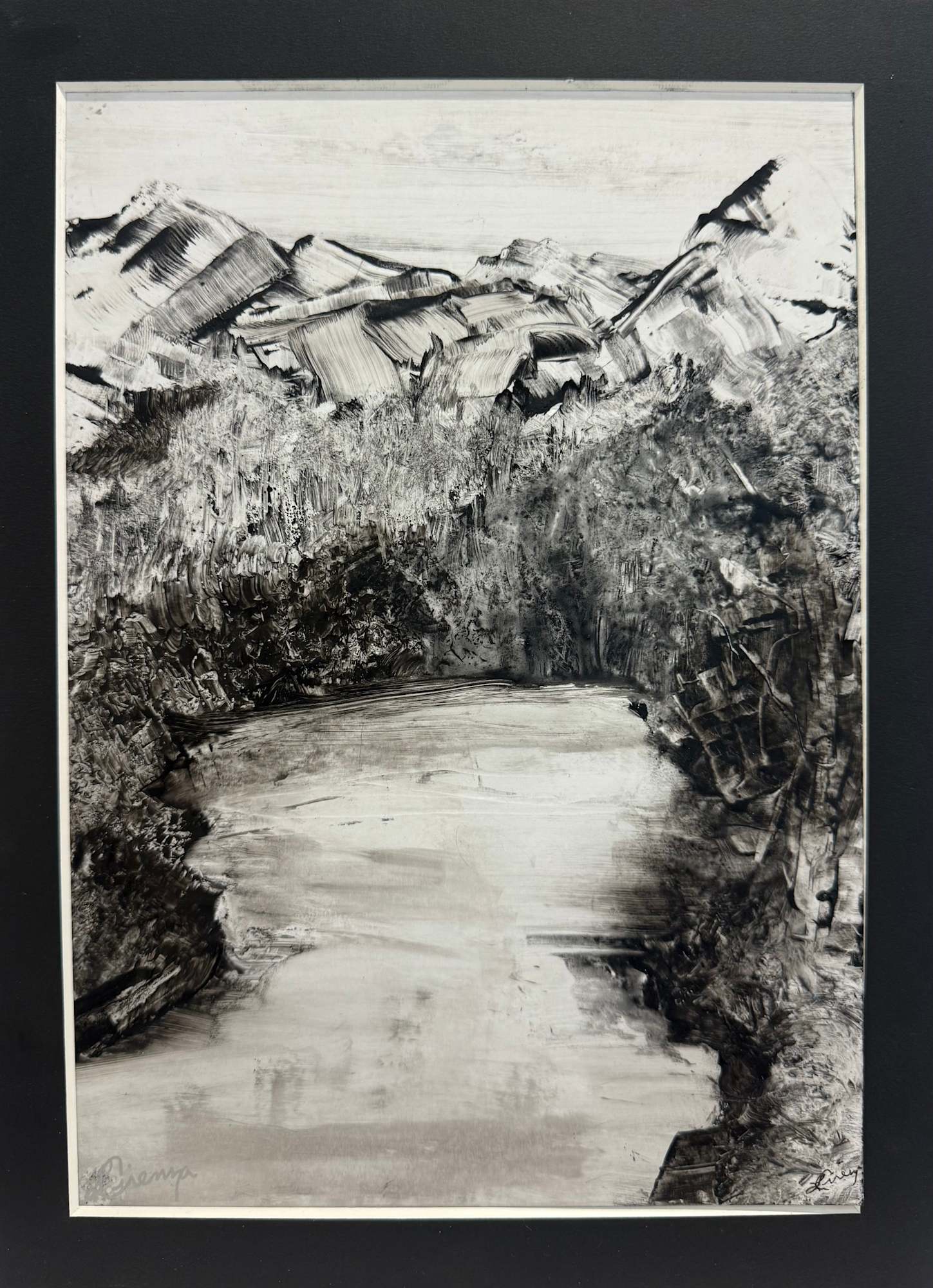 Encaustique sur papier — un paysage poétique où les sommets adoucis et une rivière tranquille se fondent en un seul souffle de quiétude.