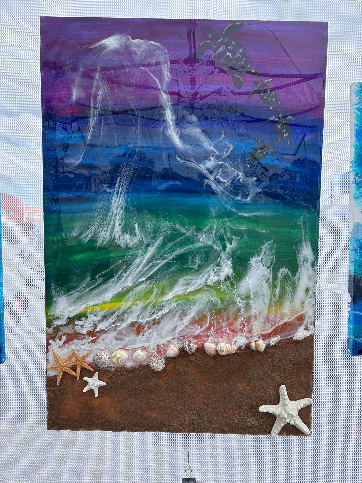 A family of four hand-painted turtles, detailed with intricate reflections, gracefully swim through the ocean’s waves, adding life and depth to the piece. The bottom of the painting features real sand and seashells, creating a tangible connection to the shore and separating the sand from the dynamic sky and ocean line above.