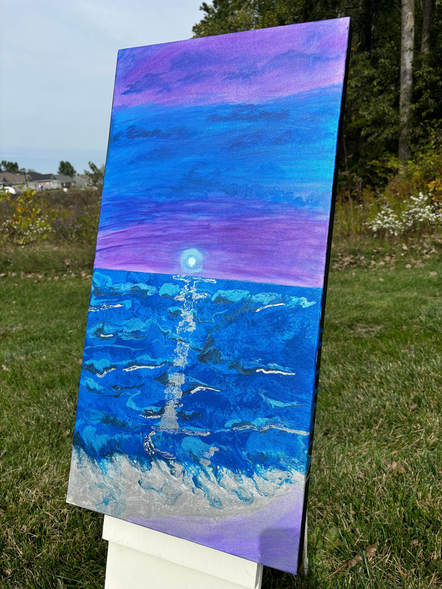 Bring the elegance of silver waves and the beauty of a purple sunset into your space with Moonlight Moment, a captivating addition to any art collection.