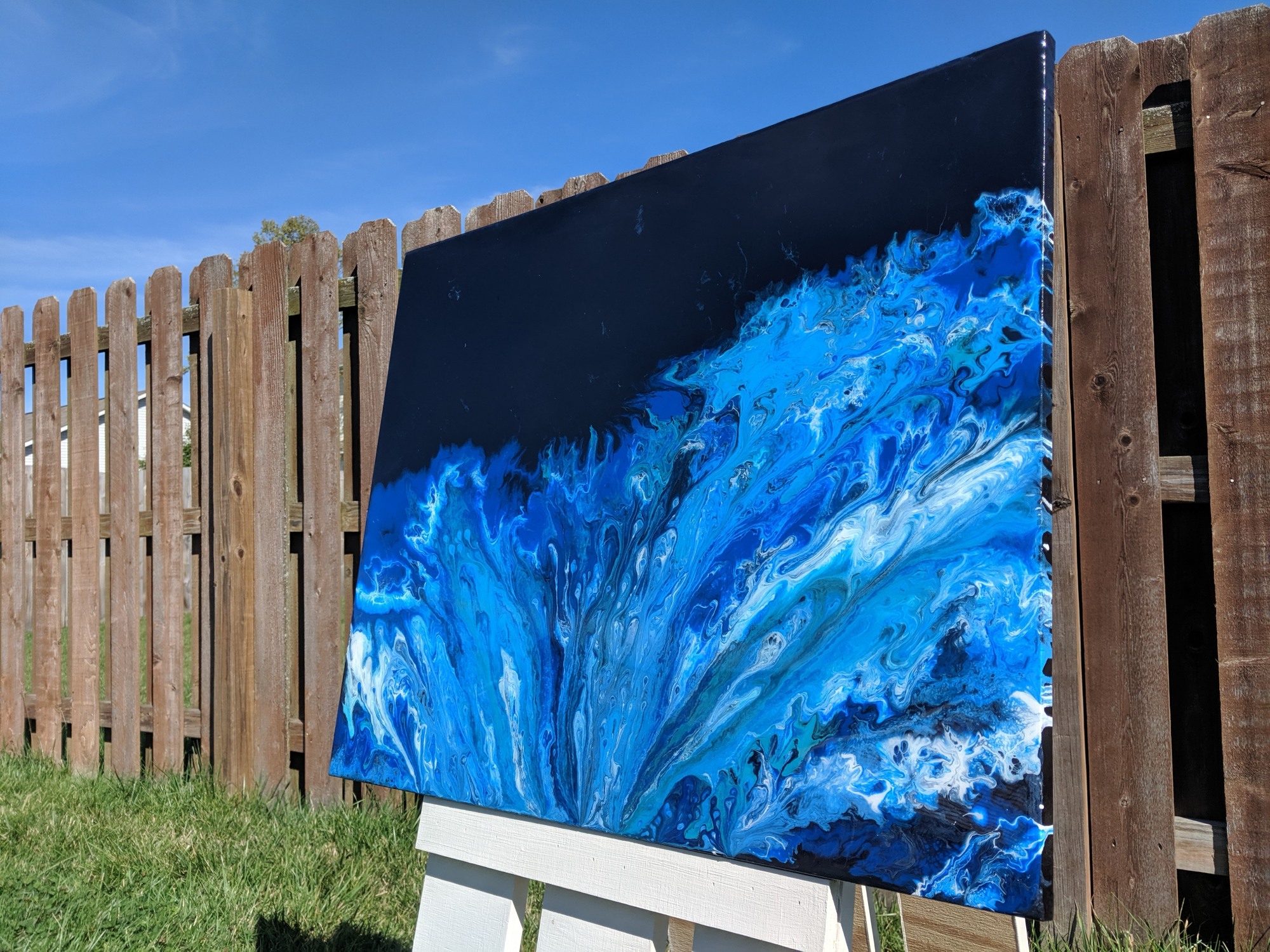 Phenomena of the Sea is a powerful acrylic painting that captures the ocean's dynamic energy in a mesmerizing fusion of movement and depth. Vibrant blues and stark whites swirl together in a dramatic surge, evoking the force of crashing waves against an expansive, inky black sky. The fluid motion within the composition mirrors the ocean's unpredictability-both wild and awe-inspiring. This piece invites the viewer to experience the raw beauty of the sea, its ceaseless rhythm, and the wonder of nature's unrelenting power.