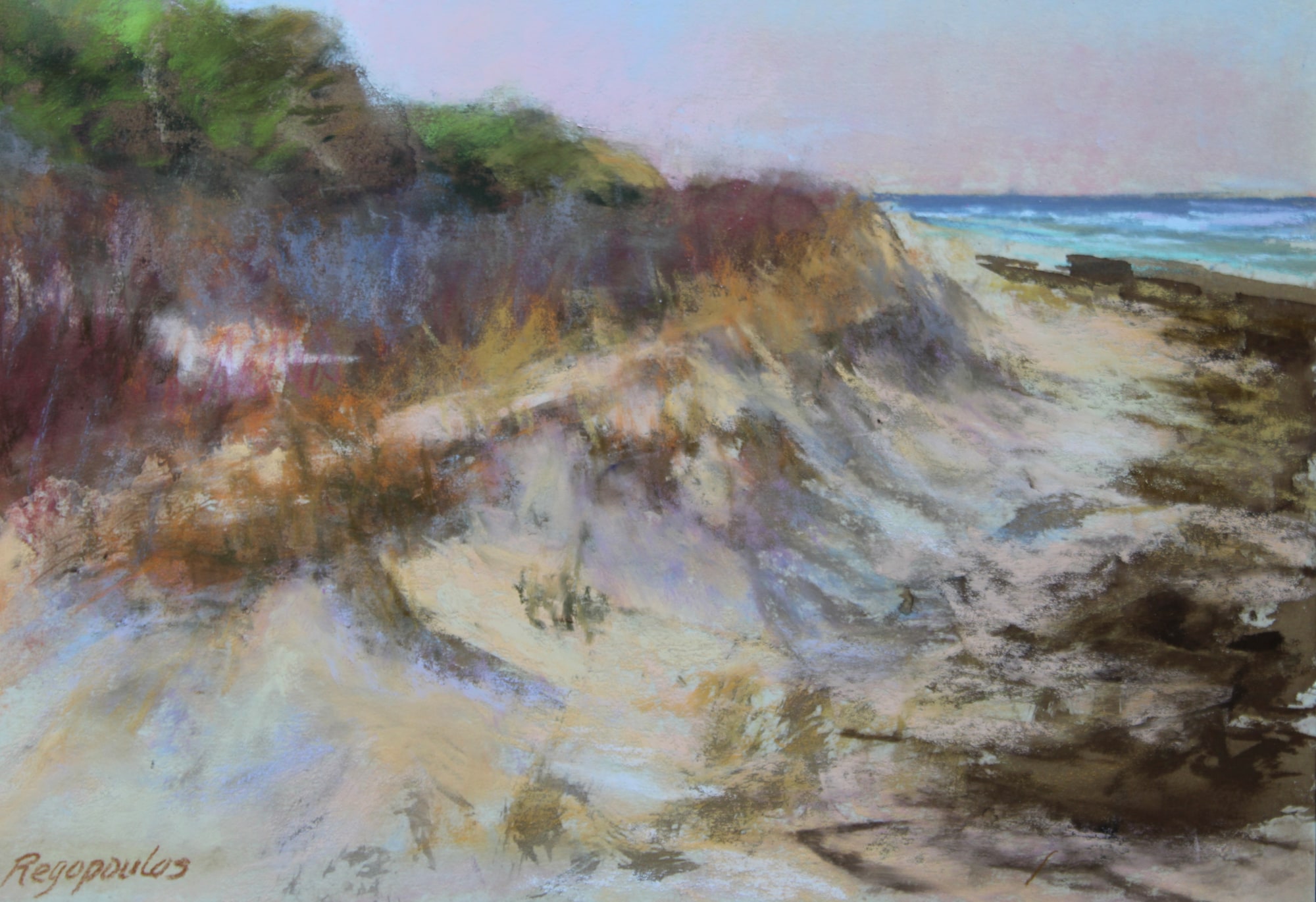 This pastel was created en plein air at Plum Island, a favorite painting and birding place. It was a sunny winter, day but there was an ocean breeze that definitely put a chill in the air. The foliage still had winter color and some beautiful neutral colors mixed in.