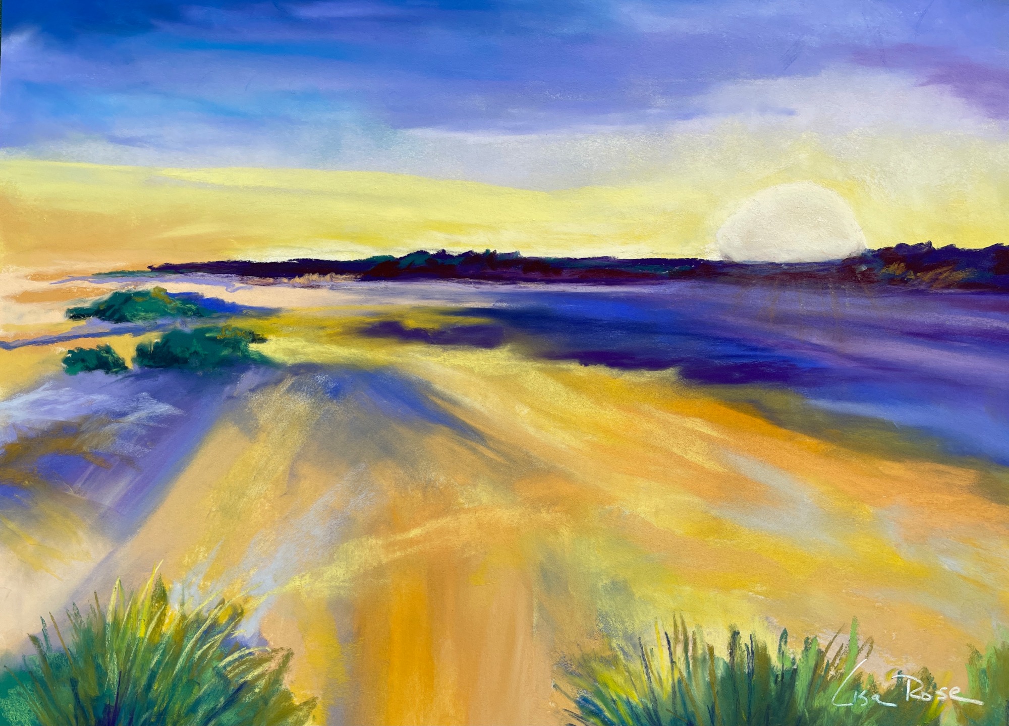 This artwork is a vibrant landscape painting primarily showcasing a dynamic and colorful horizon. The lower part of the canvas exhibits earthy tones of yellow, orange, and green, gradually blending into deeper blue and purple hues. These colors converge towards the middle of the artwork, creating a sense of depth and perspective. The upper section features a sky painted with soft gradients of blue and purple, transitioning to lighter shades towards the horizon where a large sun is setting or rising, casting a gentle glow. The overall composition exudes tranquility and the natural beauty of a sunset or sunrise over an expansive landscape.