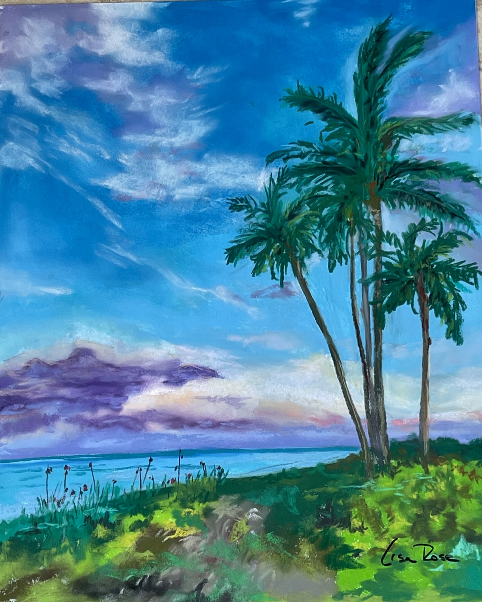 The artwork is a vibrant painting of a tropical landscape. Dominating the scene are towering palm trees, their green fronds reaching towards a vivid blue sky. The sky is detailed with soft, wispy clouds that stretch across the horizon, creating a serene and open atmosphere. In the background, the deep blue sea meets the horizon, blending seamlessly with the sky. The foreground features lush green vegetation and grasses, grounding the scene in a sense of natural abundance. The overall composition exudes a tranquil, tropical ambiance.
