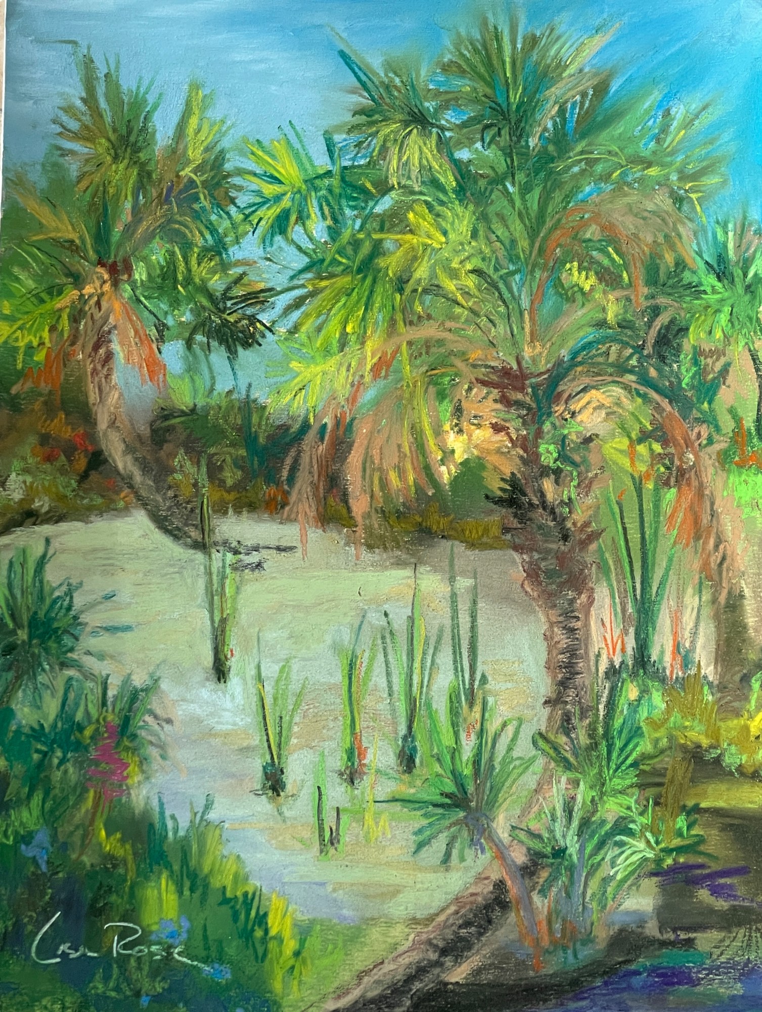 This artwork is a vibrant and colorful painting depicting a lush tropical landscape. The central focus is on two large palm trees with lush green and slightly yellow fronds, standing tall over a serene and shallow water body. The water is surrounded by various smaller plants and reeds, contributing to the lush, verdant atmosphere. The blue sky in the background enhances the tropical feel of the painting, blending seamlessly with the greenery. The artist utilizes a mix of vivid and natural colors to create an inviting and tranquil scene.