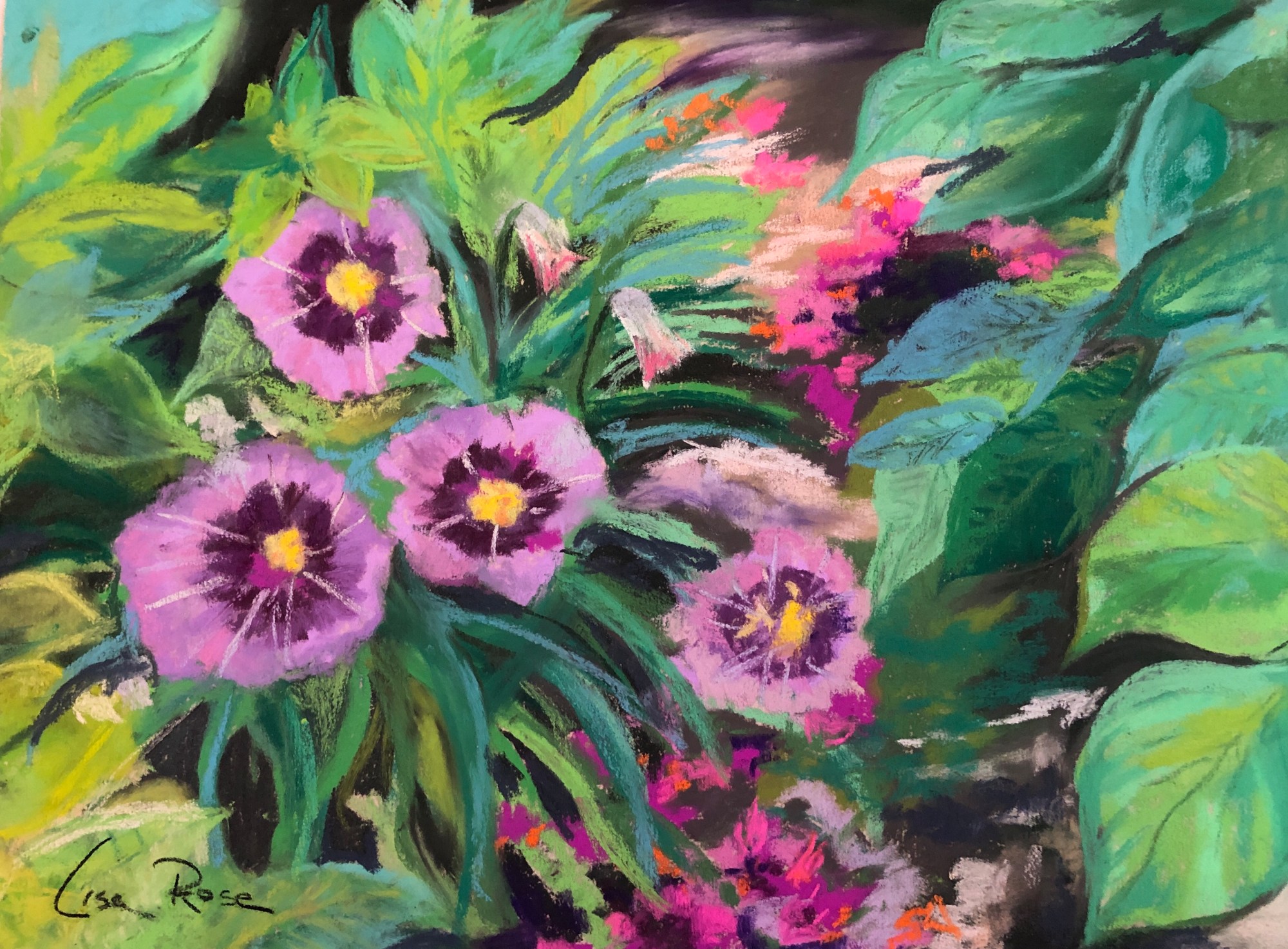 The artwork is a vibrant and colorful painting that features an array of blooming flowers. The focal point of the painting is a cluster of large purple flowers with dark centers, surrounded by lush, green foliage. The flowers are rendered with soft, fluid strokes that create a sense of movement and natural beauty. In the background, various shades of green leaves add depth and contrast to the composition. Bright splashes of pink and red flowers interspersed among the green leaves contribute to the lively and dynamic atmosphere of the painting. The overall effect is a lush, garden-like scene full of energy and color.