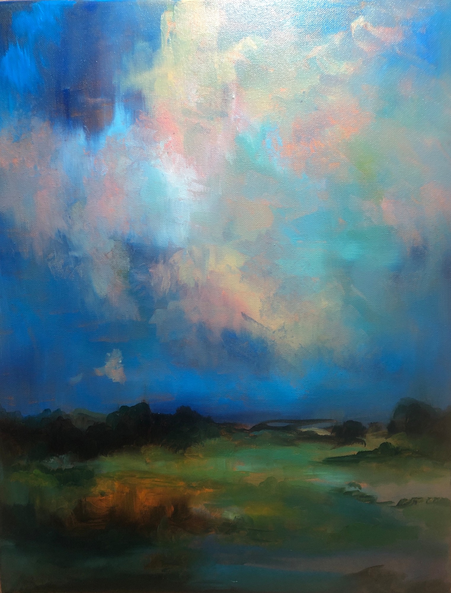 The artwork depicts a serene landscape with a striking sky. The foreground consists of a lush, green field with subtle hints of darker vegetation scattered throughout. The landscape transitions elegantly into the horizon, where it meets a vast, dramatic sky. The sky is the highlight of the piece, filled with swirling, vibrant cloud formations that are infused with a palette of blues, pinks, and creams. The overall mood created by the contrasting and blending colors in the sky and the tranquility of the landscape adds depth and a sense of calmness to the painting.