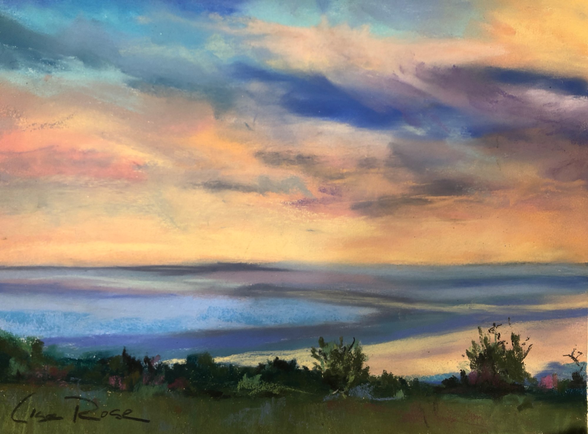 This artwork is a landscape painting featuring a serene and colorful sunset or sunrise over a body of water. The sky is rich with hues of orange, pink, and purple, blending into deeper blues and greens. The horizon stretches across the image, with layers of misty blues indicating distant water or land. In the foreground, there is a cluster of bushes or shrubbery, adding depth and framing the lower part of the scene. The overall mood of the painting is tranquil and contemplative, capturing the beauty of nature in a moment of transition.