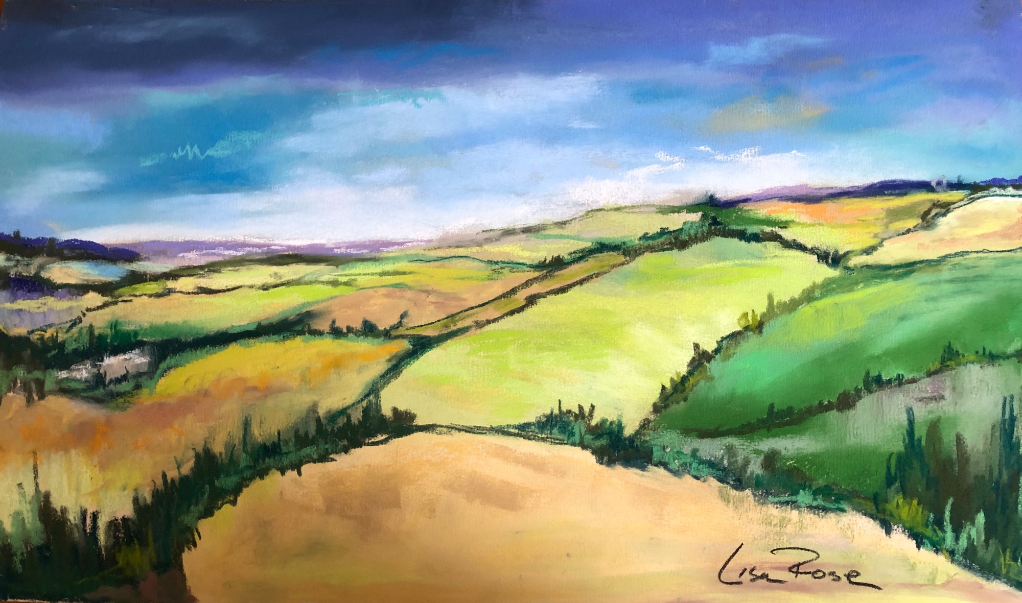 This artwork depicts a vibrant pastoral landscape. The composition is a rich tapestry of rolling hills adorned with various shades of green, yellow, and brown, suggesting fields and meadows. The colors transition smoothly, creating a sense of depth and tranquility. Darker green lines outline some areas, representing hedgerows or pathways, leading the viewer's eye through the scene. Above, a sky filled with blue and purple hues contrasts with the luminous fields below, adding a dramatic ambiance to the overall serene countryside setting.