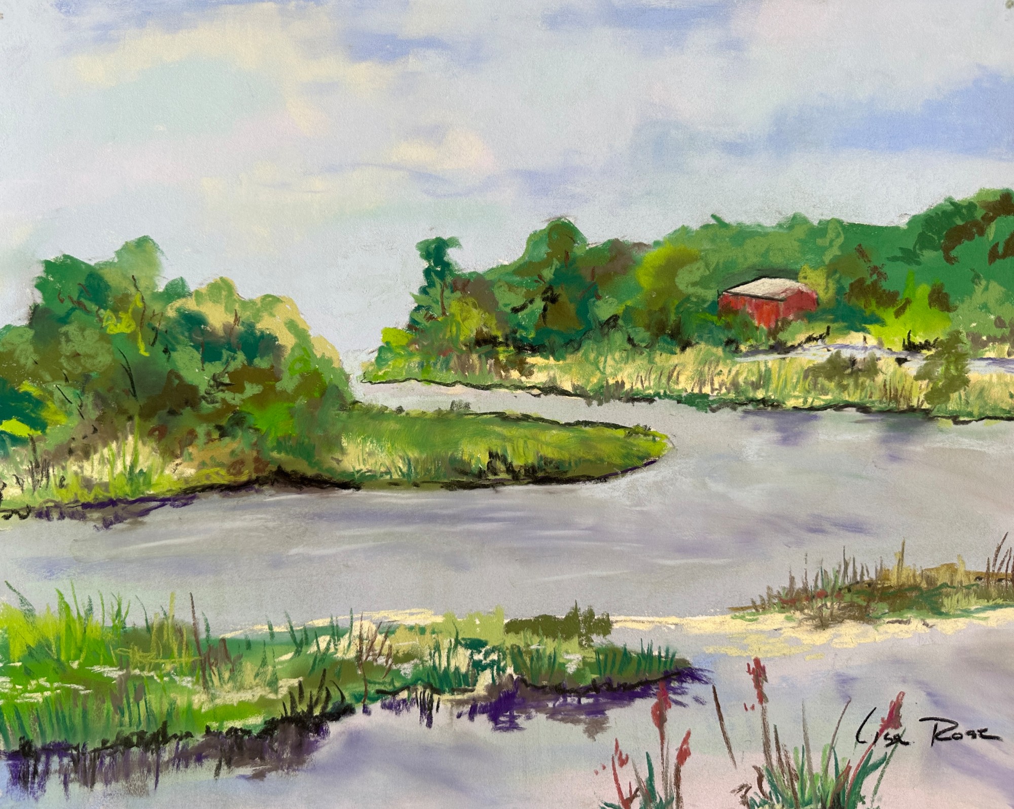 This artwork depicts a serene landscape in Indian River featuring a winding river flanked by lush greenery. The river flows through the center of the image, with the grassy banks displaying vibrant shades of green. In the background, clusters of trees create a dense, verdant canopy. Towards the right side of the painting, a quaint red building is nestled among the trees, adding a touch of contrast to the natural scene. The sky above is a mix of soft blue and light clouds, giving the impression of a calm, possibly late afternoon setting. The overall composition exudes tranquility and the beauty of nature.