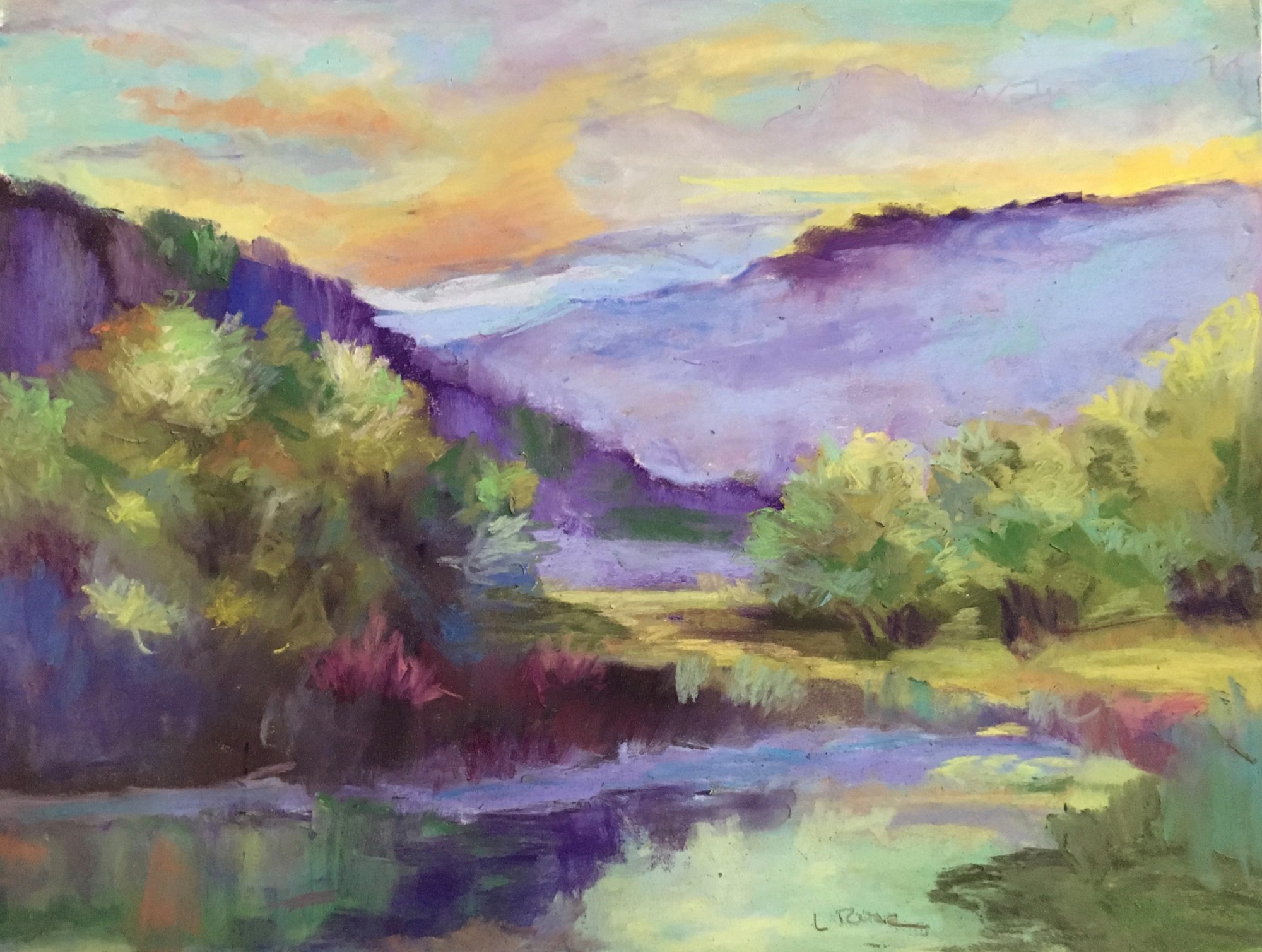 The artwork is a vibrant landscape painting featuring a blend of natural elements. The foreground includes a mix of lush green and purple vegetation, likely representing trees and shrubs, with reflections in a body of water. The midground displays a blend of green and purple hues transitioning into the distant rolling hills or mountains. The sky above is filled with an array of soft pastel colors, including shades of orange, yellow, and blue, suggesting the time of either sunrise or sunset. The overall composition showcases a serene and picturesque natural scene with a harmonious balance of colors and elements.