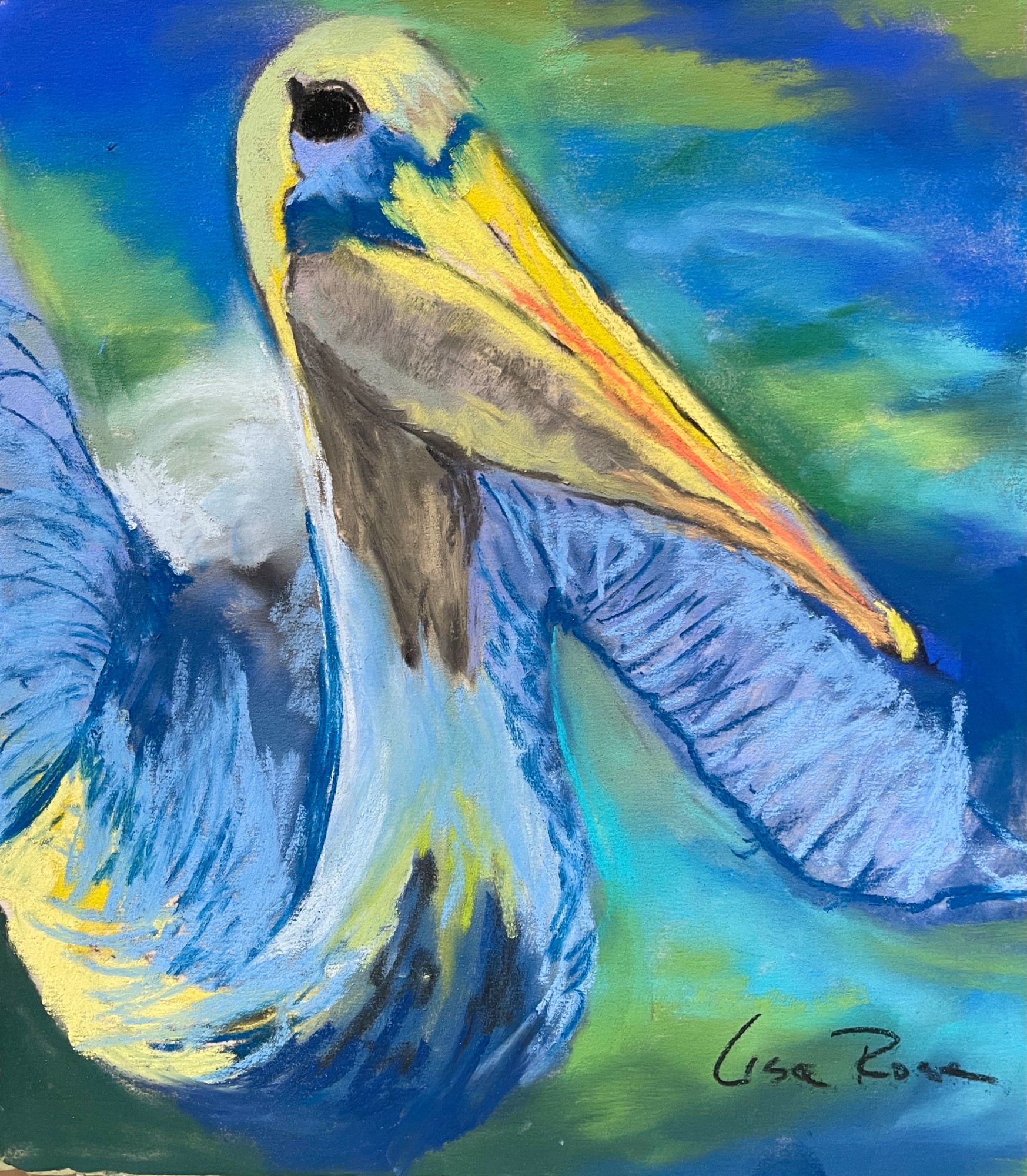 This artwork features a vibrant portrayal of a bird, specifically a pelican. The painting is full of dynamic colors, with an emphasis on blues, yellows, and greens. The pelican's long beak is prominently displayed, transitioning from a yellow at the base to an orange near the tip. The bird's feathers are depicted with strokes of blue and white, blending seamlessly into the colorful background, which consists of various shades of green and blue, creating a lively and harmonious scene.