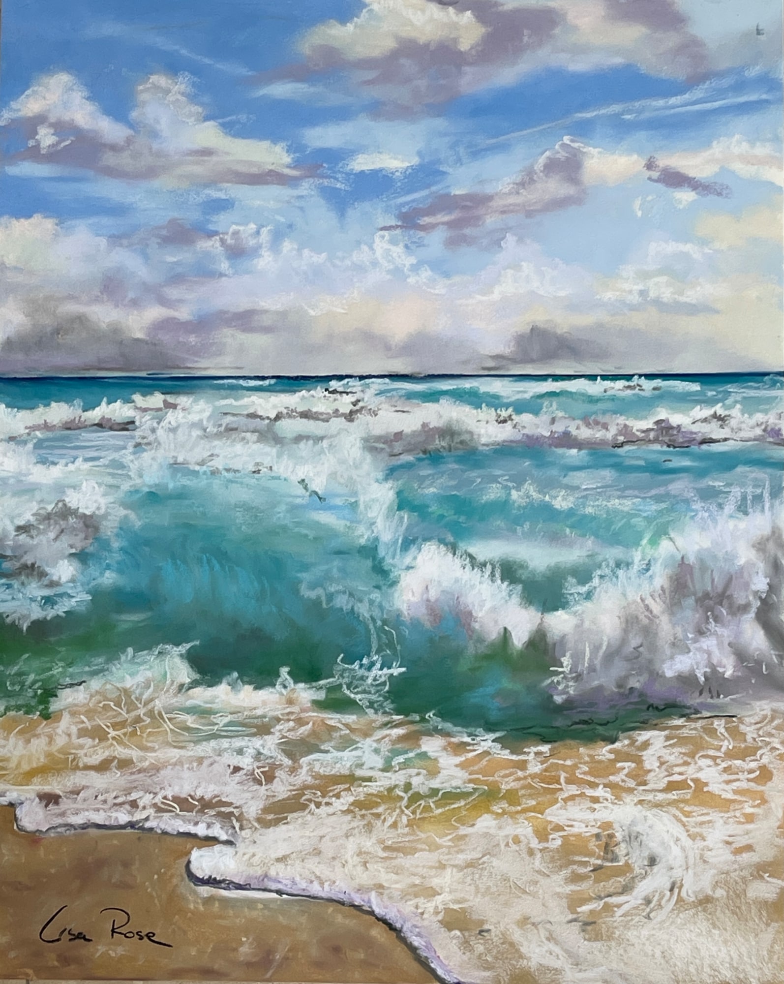 The artwork is a vibrant, realistic painting of a seascape. The scene captures the dynamic movement of ocean waves crashing onto a sandy beach under a partly cloudy sky. The water showcases various shades of blue and green, enhancing the sense of depth and motion. The waves are detailed with white foam, illustrating their power and energy as they meet the shore. The sky above features soft, wispy clouds with hints of sunlight breaking through, contributing to the overall tranquil yet lively atmosphere of the painting. The piece masterfully combines vivid colors and fluid brushstrokes to create a refreshing and immersive depiction of the sea.