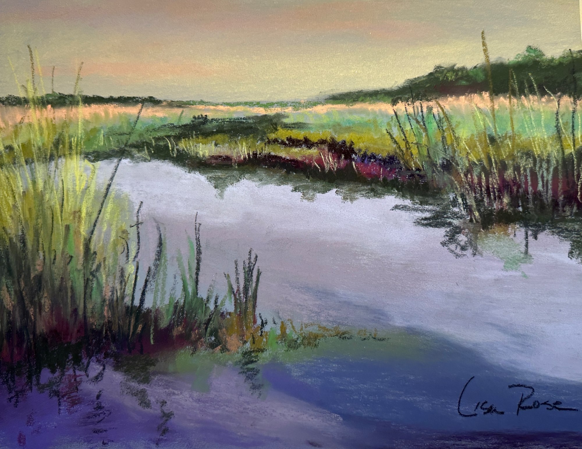 This artwork is a serene landscape painting, depicting a tranquil water body surrounded by lush vegetation. The foreground features tall grasses and reeds, rendered in shades of green, yellow, and brown, while the middle ground showcases a calm water surface reflecting the surrounding colors. The background has a mix of soft pastel hues, transitioning from green to pink and orange, indicating an early morning or late evening sky. The overall impression of the painting is peaceful, with a harmonious blend of natural elements and a soothing color palette.