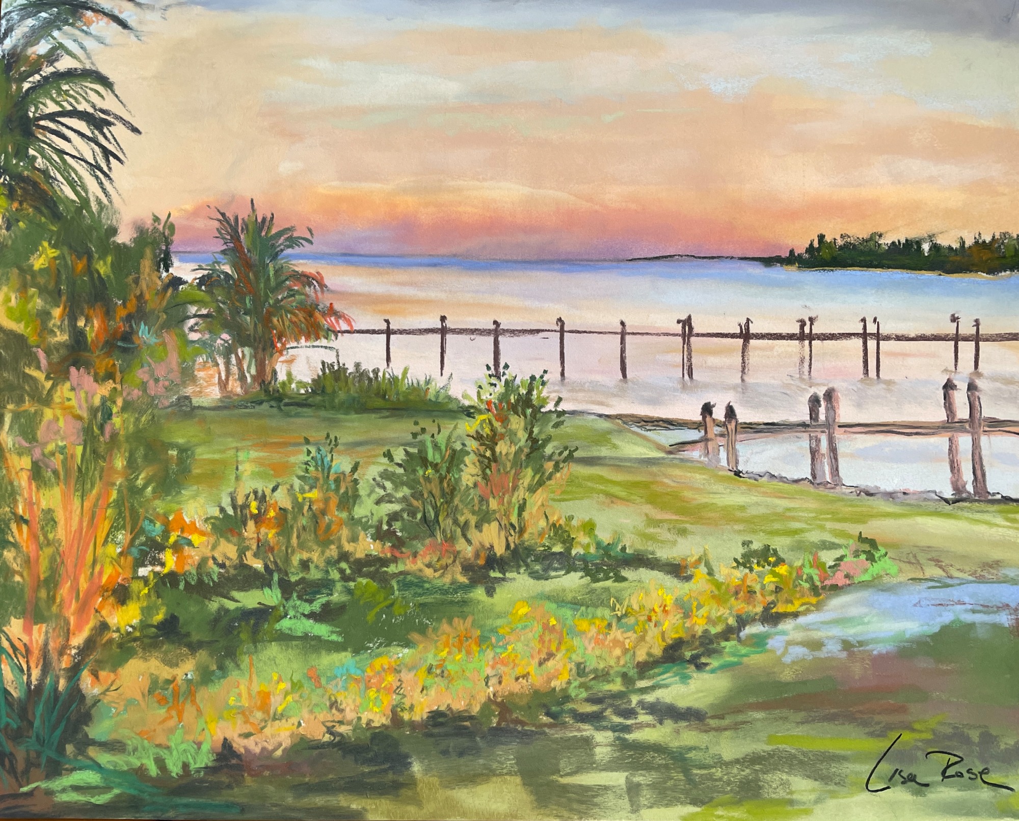 This artwork is a serene landscape painting depicting a coastal scene at sunrise. In the foreground, lush greenery and vibrant plants are rendered with various shades of green and yellow, adding depth and texture to the scene. Toward the middle, a wooden pier extends out into the calm water, leading the viewer's eye towards the horizon. The water reflects the warm hues of the rising sun, which casts a delicate orange and pink glow across the sky, blending harmoniously with the cooler tones of twilight. In the background, distant landforms are faintly visible, adding a sense of depth and tranquility to the overall composition.