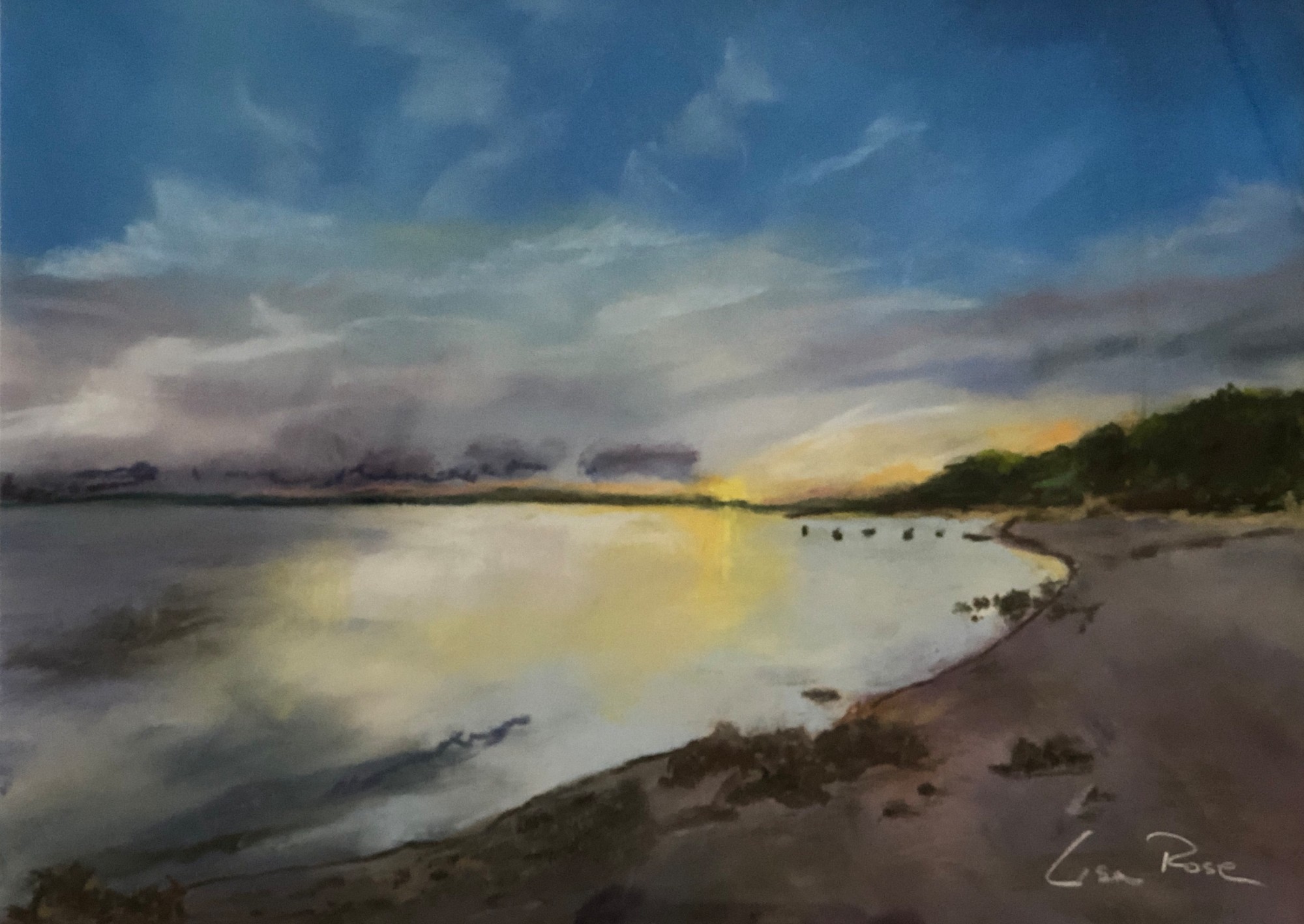 The artwork is a soft and serene landscape painting depicting a coastline during a tranquil sunset. The sky, painted with various shades of blue, gray, and purple, is partially covered by wispy clouds, giving a sense of depth and atmosphere. The horizon is lit with a brilliant yellow glow where the setting sun meets the ocean, casting reflections on the calm water. The right side of the painting features a shoreline with sparse foliage and a shadowy foreground that gradually slopes down to the water. The overall composition captures the peaceful and reflective mood of a sunset by the sea.
