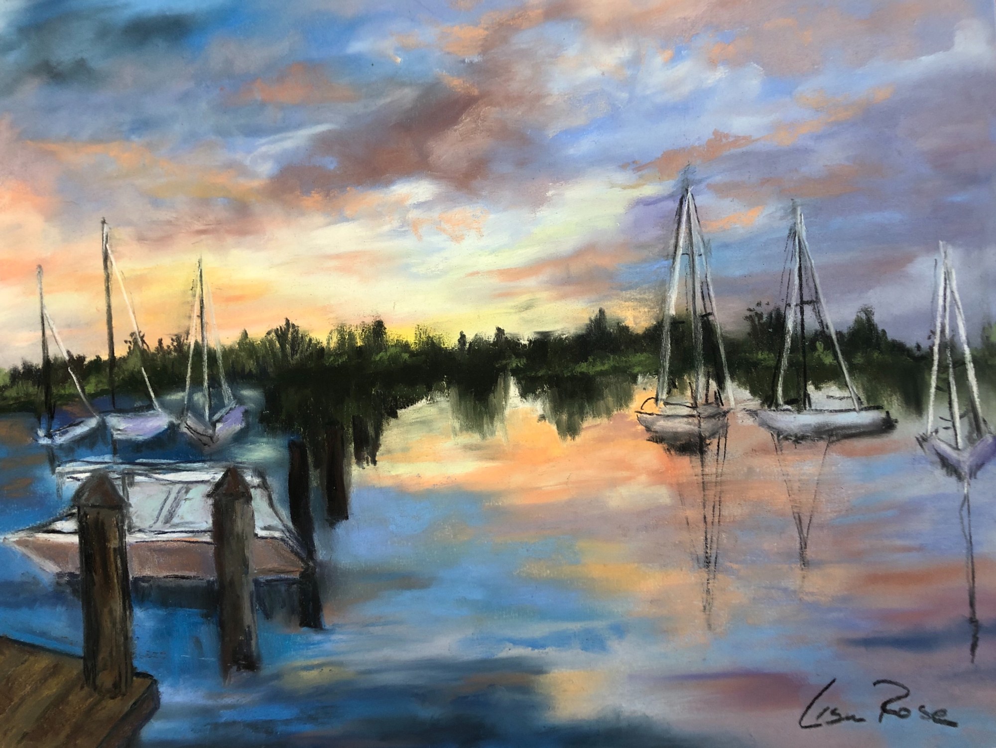 This artwork depicts a serene waterfront scene at sunset. The sky is painted with vibrant hues of orange, pink, and blue, blending together to create a tranquil and picturesque evening atmosphere. Reflections of the colorful sky can be seen in the calm water below, enhancing the peacefulness of the scene. Several sailboats are anchored in the water, their masts reaching up towards the sky, and their reflections mirrored in the water. The background is dominated by a dark, lush treeline, providing a contrast to the bright and lively colors of the sunset and the water. The brushstrokes and use of color create a soft, dreamlike quality in the painting.