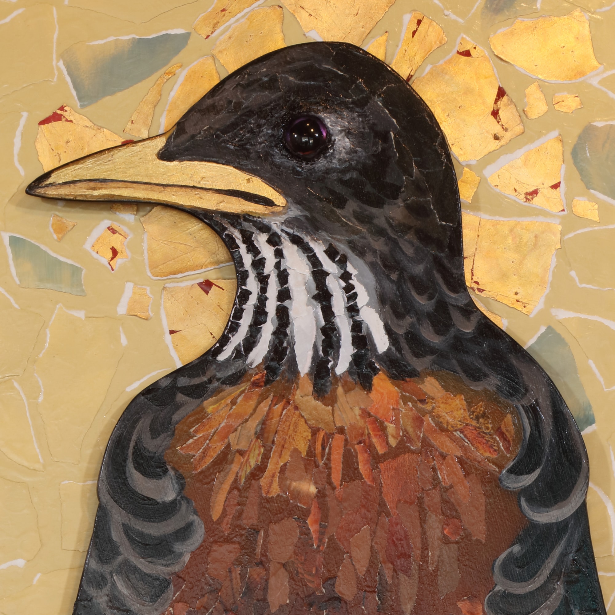 - acrylic on wood panel, paper collage, gold leaf, glass, wire.