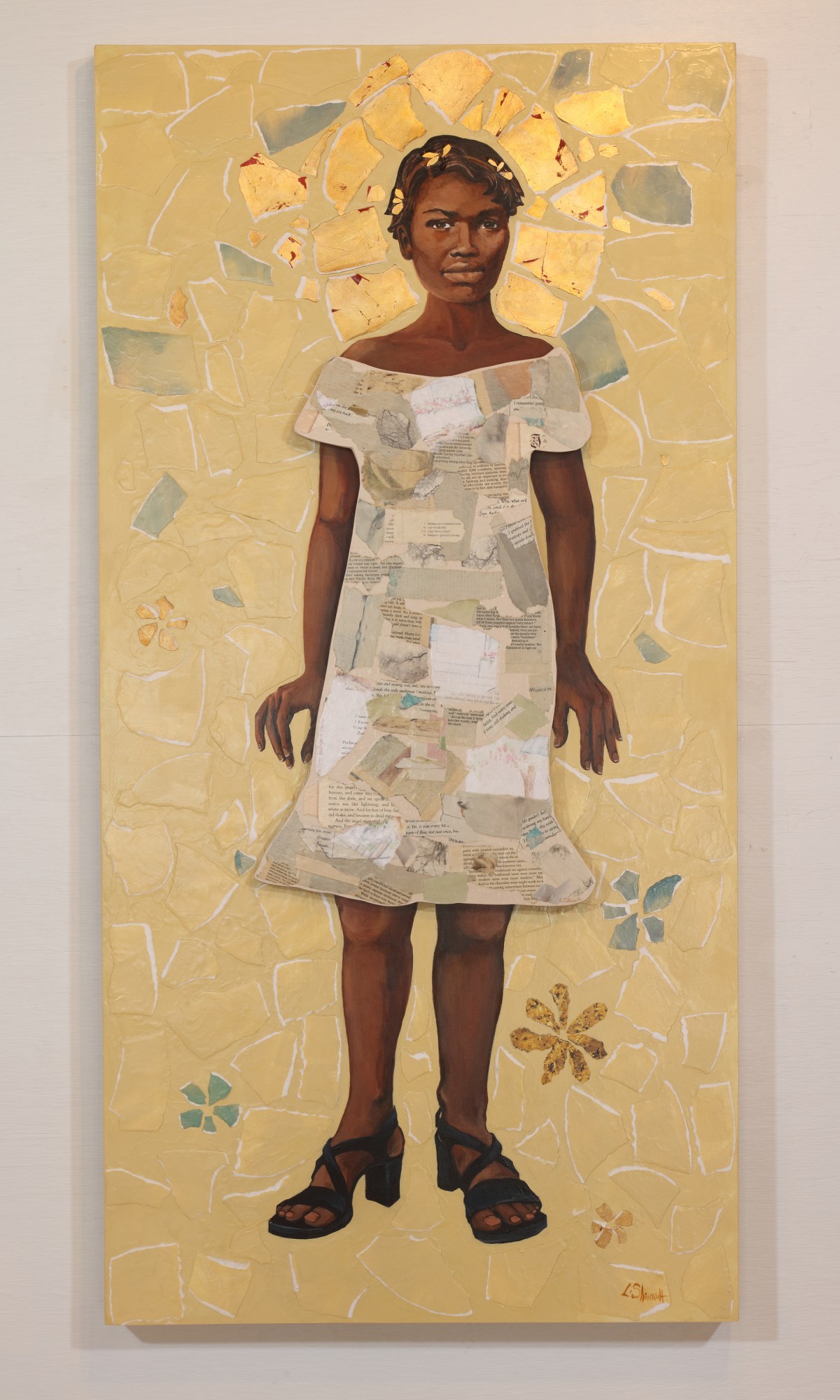 Making up this piece are custom shaped wood panels that can be taken on or off of the main figure who powerfully returns our gaze while wearing her gold leaf slip. She awaits to be adorned with any of her three 'outfits', first being "Robin Cape", which allows her to transform into a birdlike goddess. Next is "Blue Dress", created to resemble a dress my mother made for herself as a young lady. The final dress is "Unsalted Butter" similar in pattern to "Blue Dress" but made up of monotone collaged words and images including a recipe containing the words, unsalted butter, hence the name of the dress. All panels look great by themselves as well as on the main figure panel.