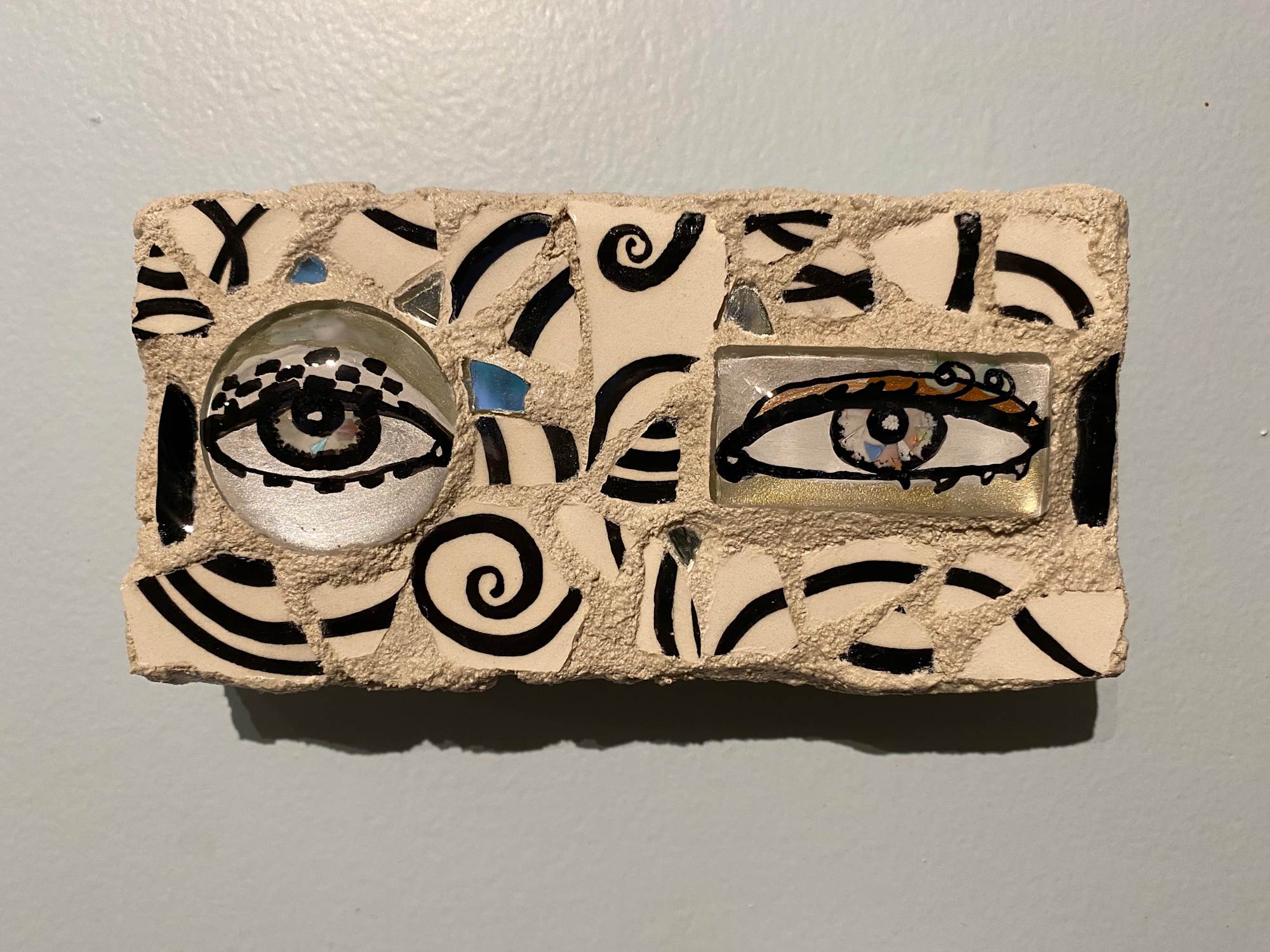 A pair of unmatched eyes made to hang on a wall to 'keep and eye on things'. This is number 27 of LiShinault Reflector Eye Mosaic series on stone tile.