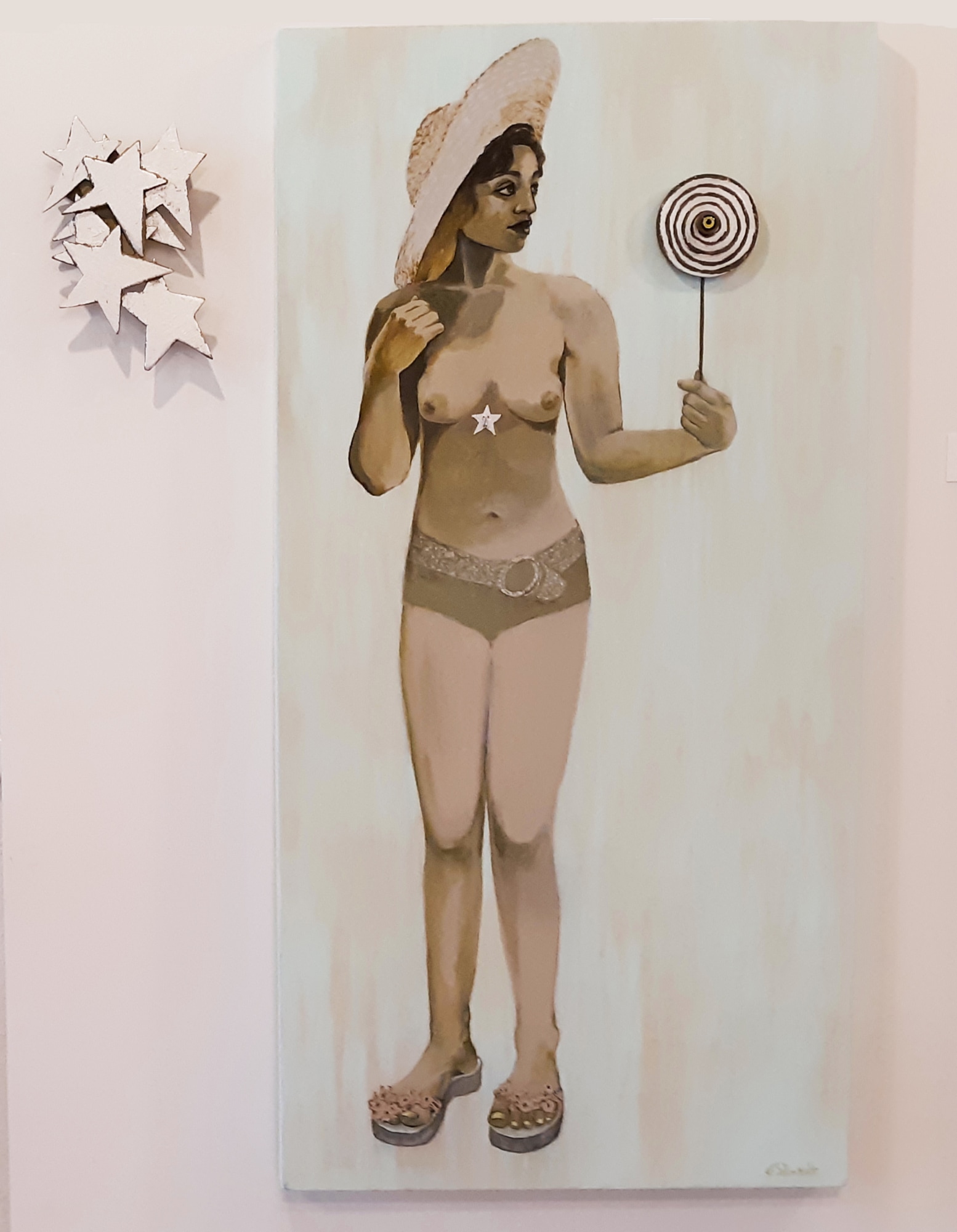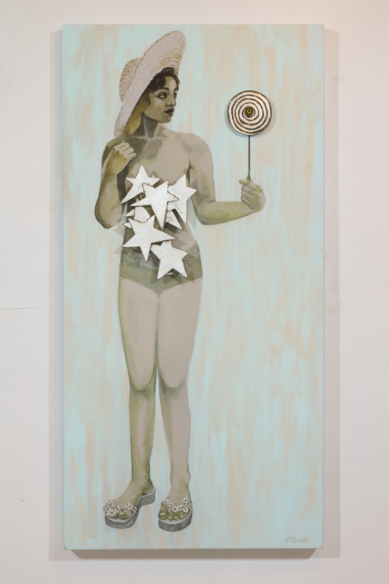 "Shimmer", part of the "Dressing Room" series is an interactive triptych. Making up the triptych are custom made wood panels that can be taken on or off of the main figure. These wood panels include a dazzling array of stars that can be placed over the upper torso. The second panel is a dreamy long dress which when placed on the figure extends a few inches below the base of the main panel. In addition the figure holds a permanently attached spinning spiral which can spin when spun as seen in the video link.