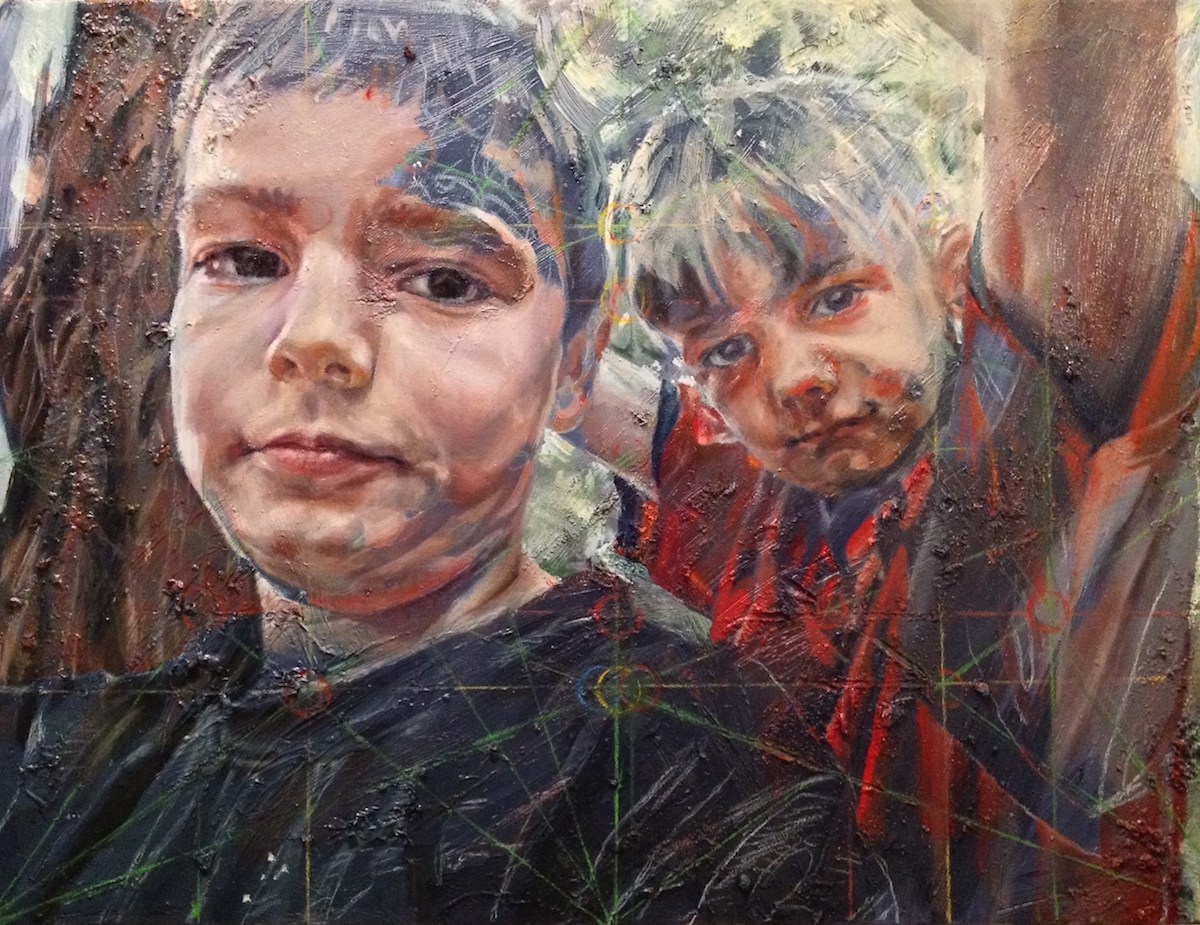 Even when we are young, we are made of such mysterious complexity that no one can know what we are capable of becoming. The two figures here are connected by an inexplicable force. Map marks and symbols fade into view like glimpses of ley lines from another dimension. These boys are unified when confronted by onlookers. Whatever happened between them is nothing in the face of their solidarity.