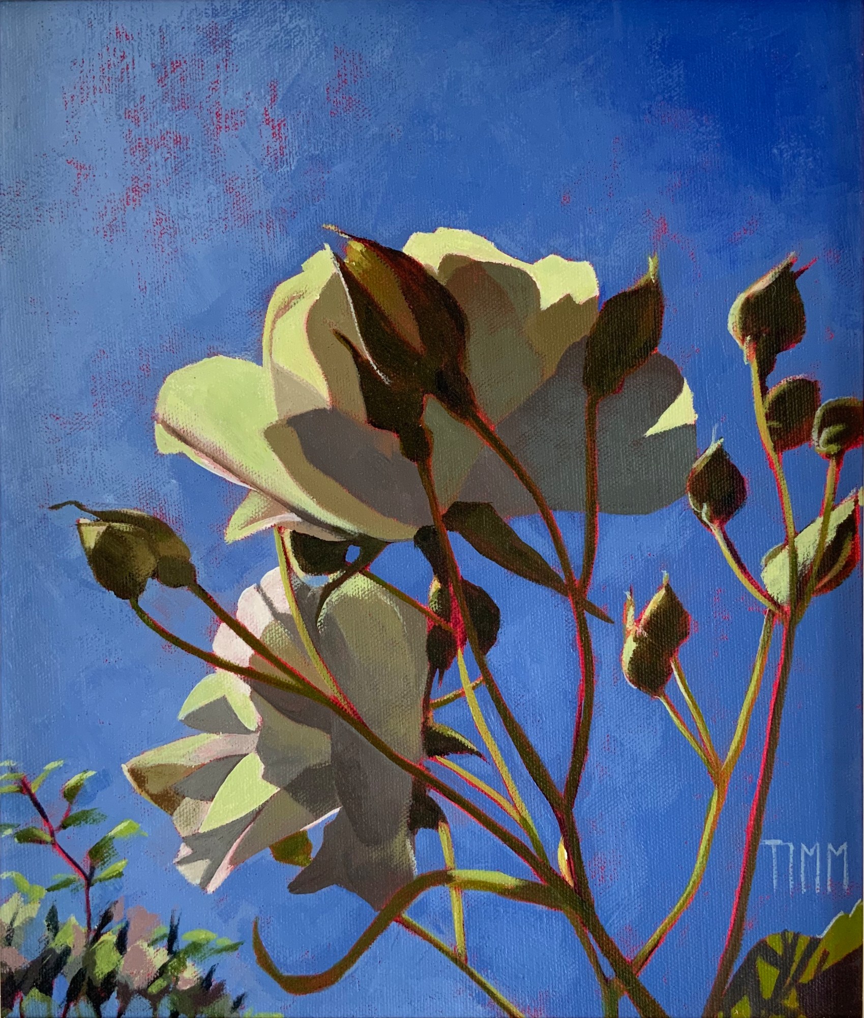 'Perfect Day' is part of a series of paintings which aim to immortalise the 'perfect' summer day. From this artwork, we can observe the products of a quintessential British garden during this (mostly) fruitful season. The two, central white roses dominate the composition, sprouting multiple rose buds. From these rose buds, ranging from the forefront to the background of this composition, produces a three-dimensional effect. The piercing blue sky appears to surround the white roses in a lighter shade, as if they are iridescent. This lighter shade can be traced upward, towards the heavens, emphasising their purity of colour.