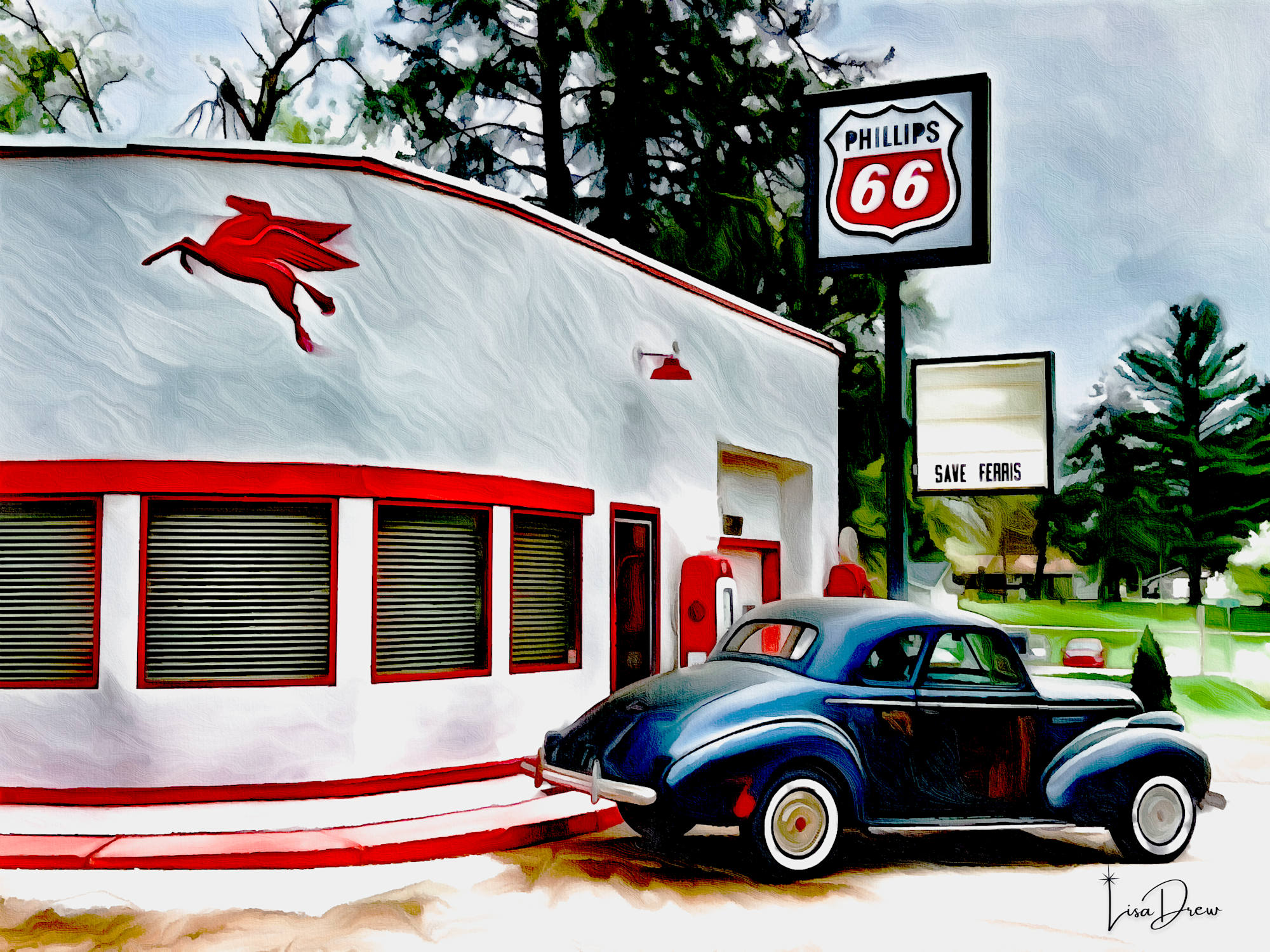 Part of the series "Lisa's Road Trip" This old buick was found parked in front of a vintage gas station in Wisconsin. The building is now painted BLACK. I was happy to photograph this while it was white capturing all the detail.