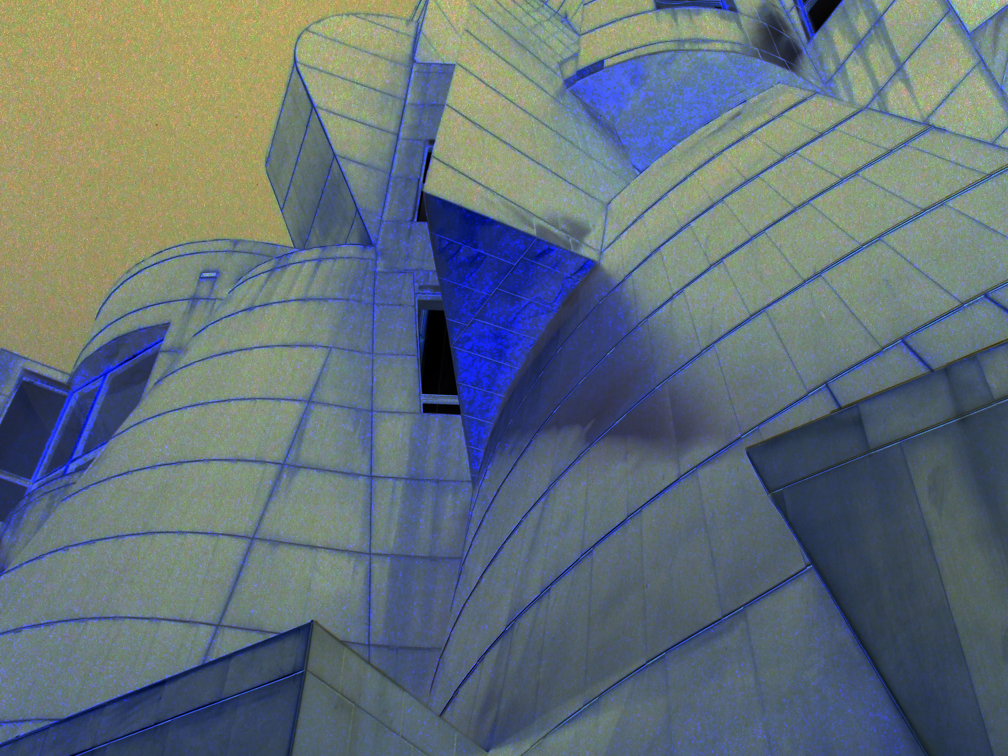 Photographed on a chilly February night in Minneapolis and then using a reverse image process to create negative of the original image. This resulted in a blue and gold effect to my delight. This image is also seen on Minneapolis Public Television from time to time.