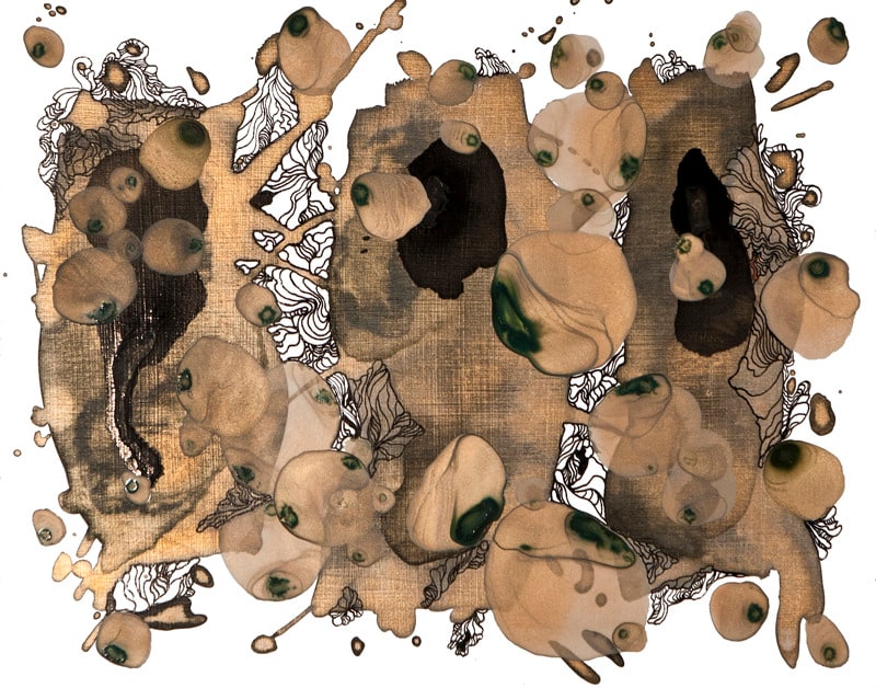 Painting, acrylic; black, brown shades; rectangular (un-framed); acrylic and ink on wood panel with artist made collage (mixed media); abstract, "#2 From the Nymph Series, c. 2014," 11" x 14;" artist Priscilla Fowler.