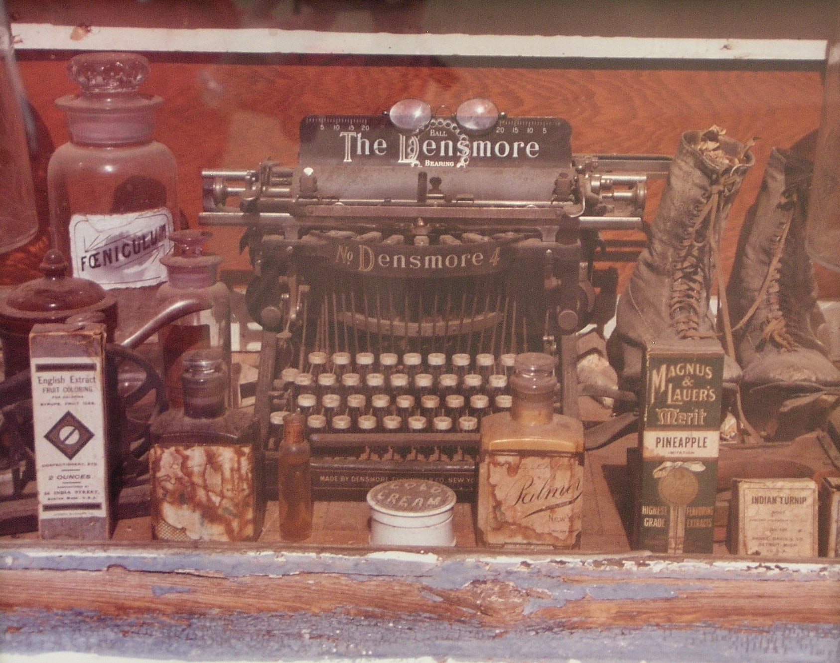 Colored photograph titled "Antiques," By Jerry Valdez, 1978. Framed in Colorado barnwood. Pictured are a Densmore typewriter, a pair of leather high top shoes (laced), a box of Magnus & Laver's Merit Pineapple Flavoring, a box of Indian Turnip Root, a jar of cold cream and five pharmacy bottles, one labeled "Foeniculum" and one labeled "Palmer Rose Leaves." A pair of old glasses rests on the typewriter.