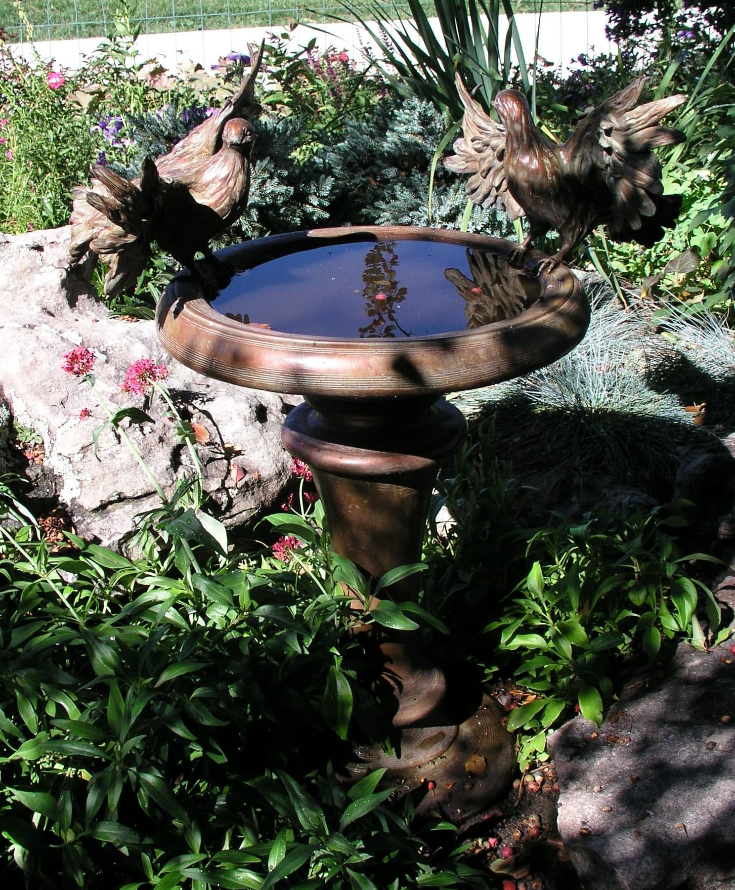 "Break Time" birdbath by Georgene McGonagle, 1998; cast bronze; round shallow bowl on top of round columnar tapered base; base wider at top, with undulating scotia & torus shapes at bottom; top edge of bowl rounded; two bronze pigeons with outstretched wings rest on rim; feathers are ruffled; birds are looking in opposite directions; wide circular base.
