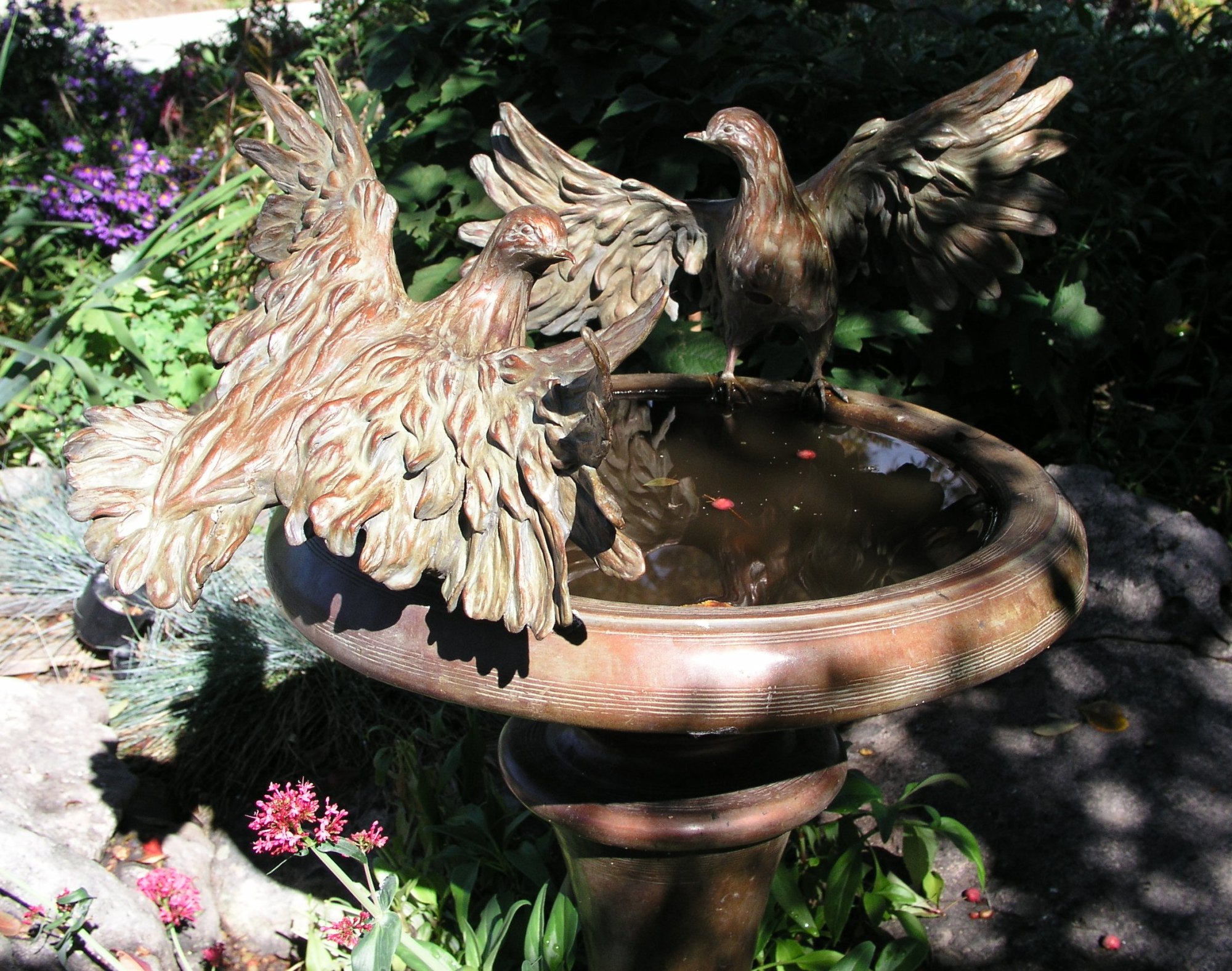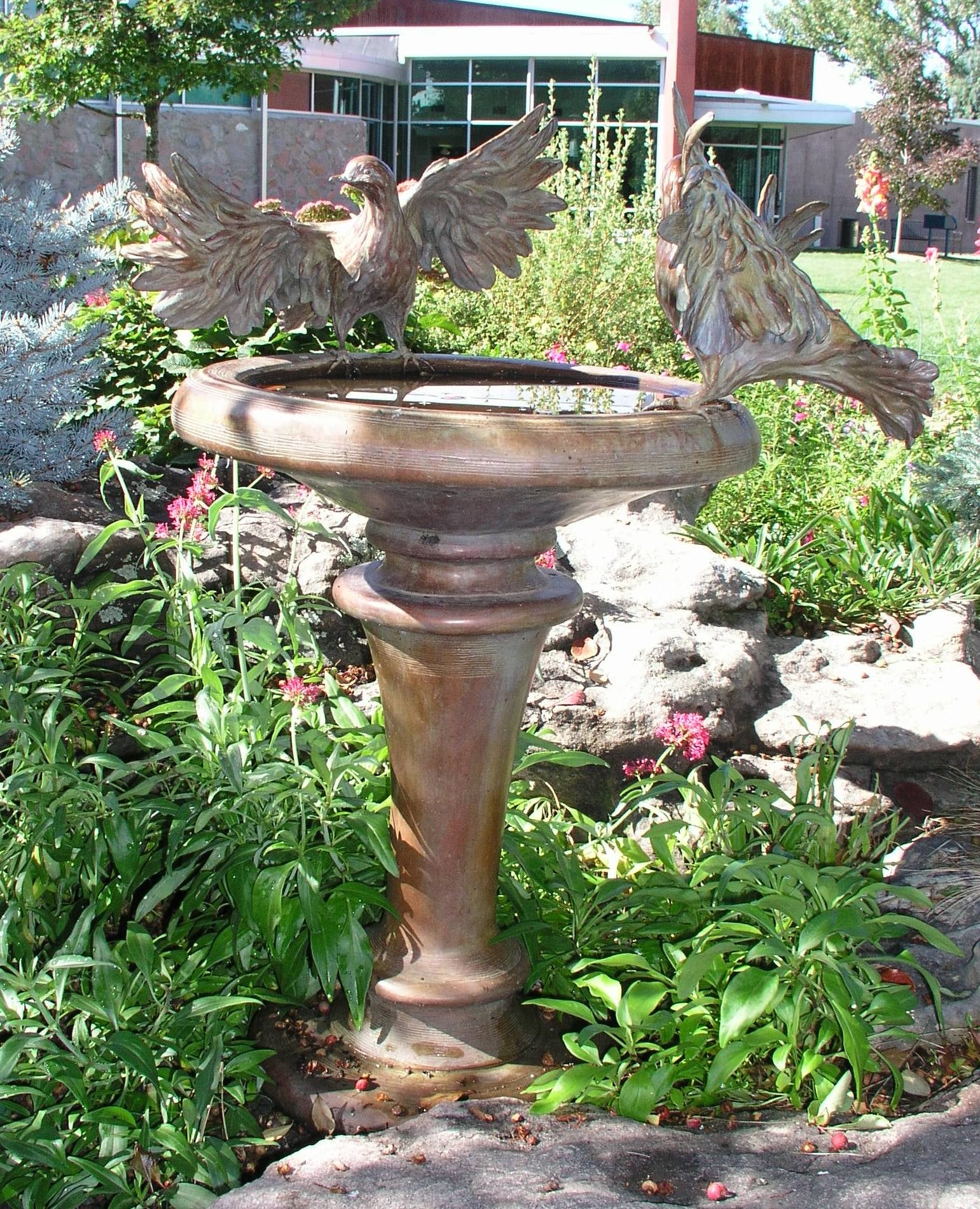 "Break Time" birdbath by Georgene McGonagle, 1998; cast bronze; round shallow bowl on top of round columnar tapered base; base wider at top, with undulating scotia & torus shapes at bottom; top edge of bowl rounded; two bronze pigeons with outstretched wings rest on rim; feathers are ruffled; birds are looking in opposite directions; wide circular base.