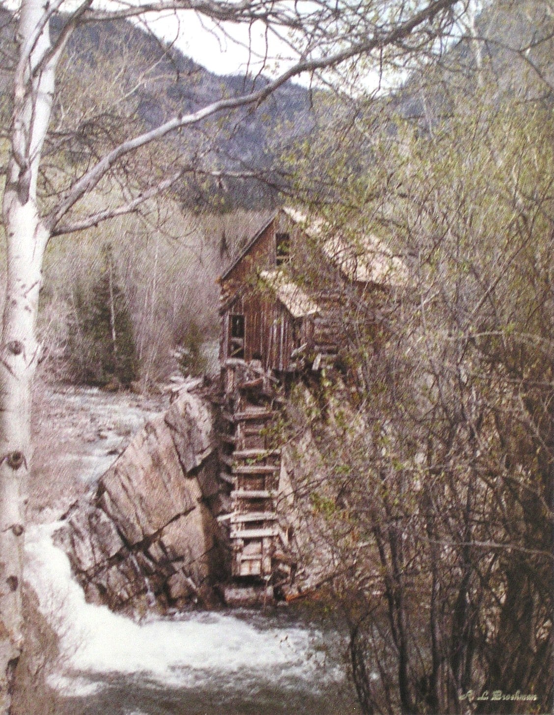 Colored photograph of the Sheep Tunnel Mill on the Crystal River by the ghost town of Crystal City, Colorado. Double matted and framed in a contemporary gold frame. Titled "Crystal Mill." By Robert L. Brockman, 1978.