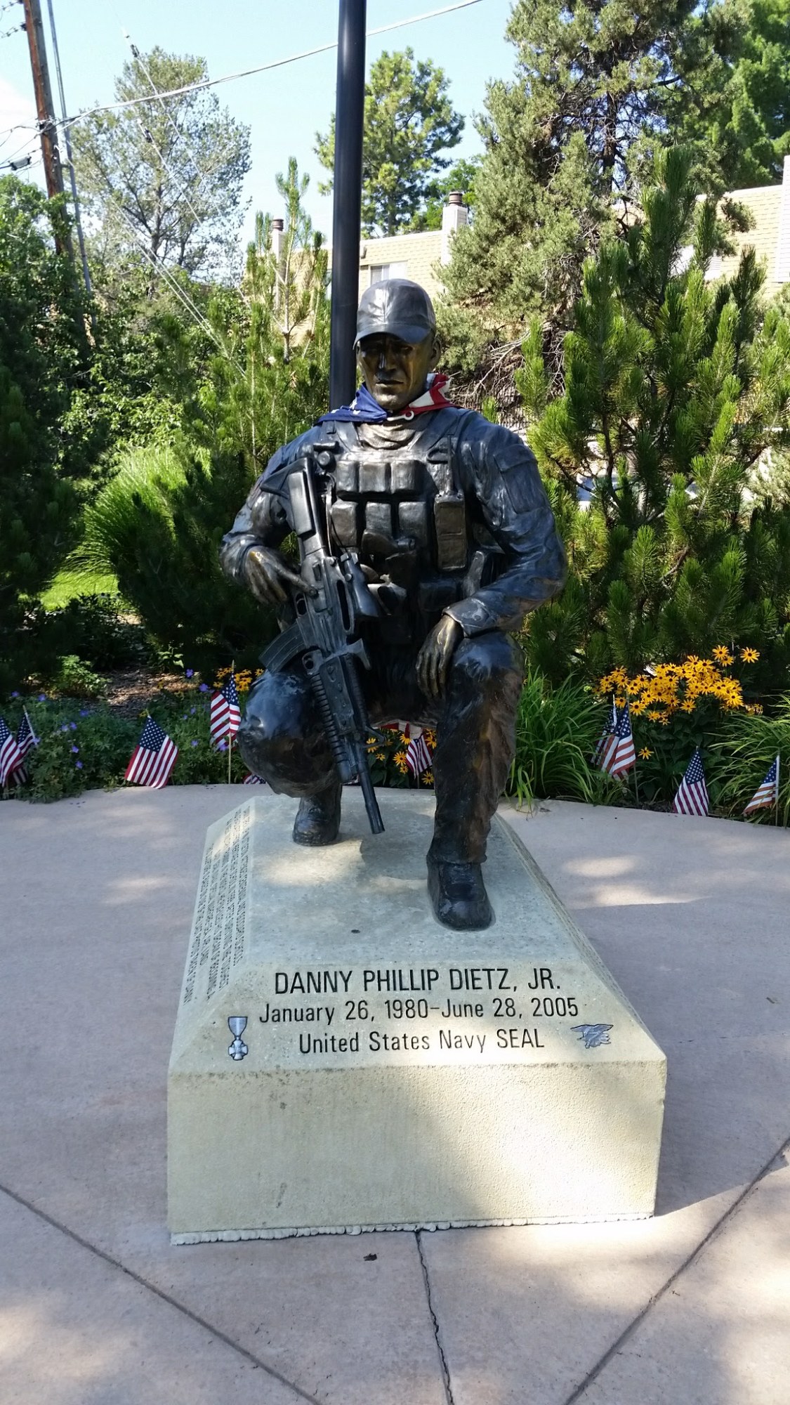 "Danny Dietz Memorial" by Robert Henderson. Bronze sculpture of kneeling Navy SEAL with rifle, located at west side of Berry Park, Littleton. Sculpture was purchased by the City of Littleton, along with funds from a public fundraiser.