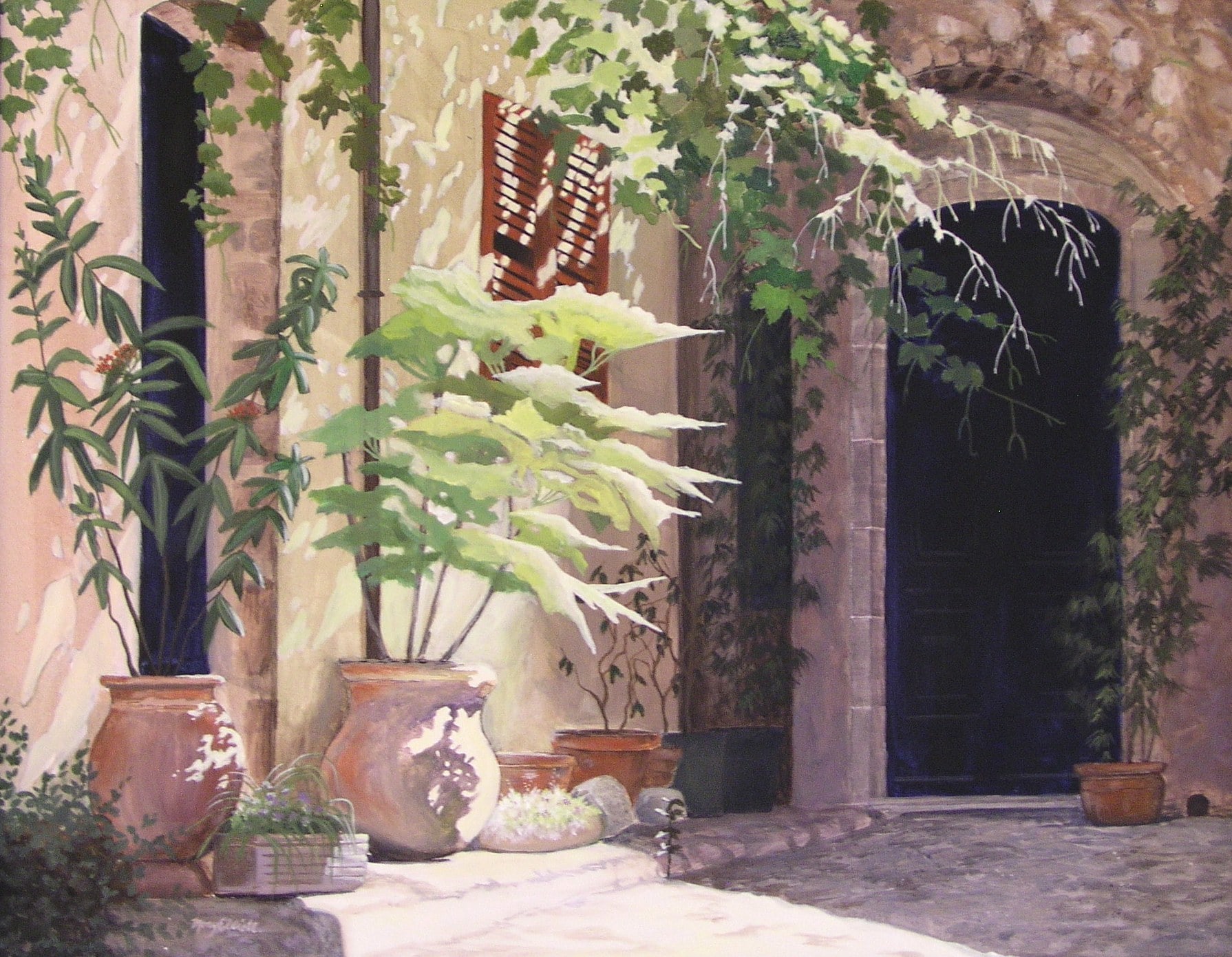 "Filtered Sunlight" by Mary Elliott, 2001; acrylic on canvas; image of patio with plants in clay pots; arched doorway has climbing plant over it; window is shuttered; sunshine and shadows; colors in shades of green, beige, reddish-brown, deep blues & grey; reddish-brown wooden frame.