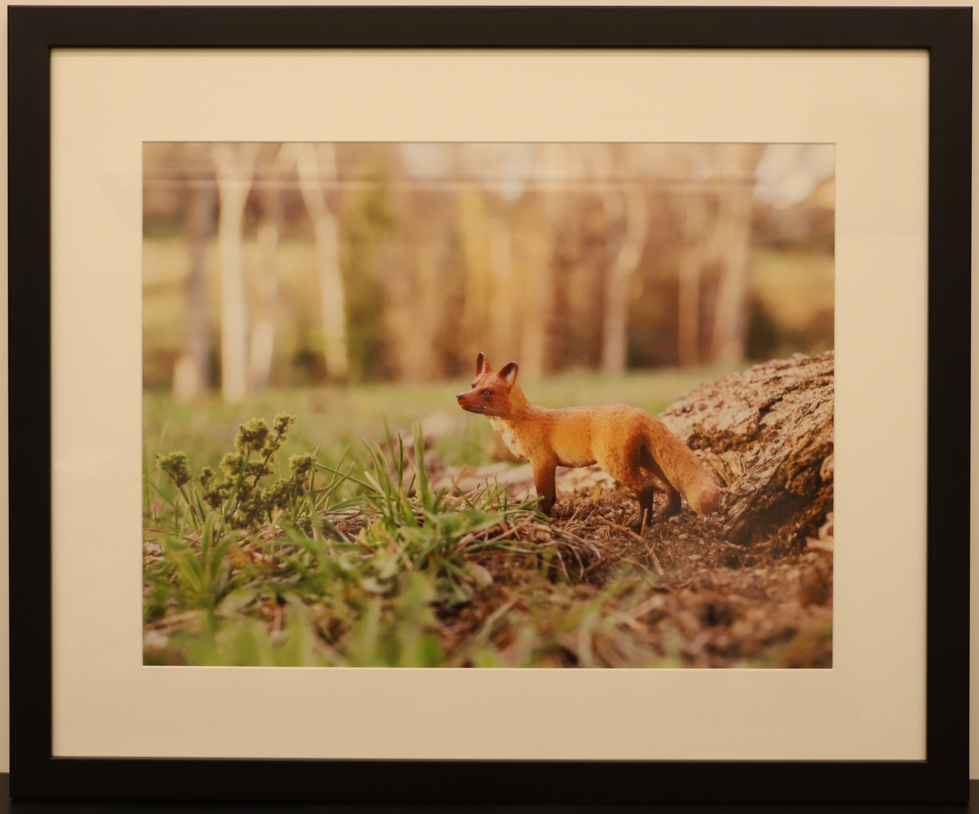 "Fox" by Samantha Pavelsek-Simmons; digital color photograph; rectangular photographic print with reddish-orange, black, green, brown, and white coloring, printed on photographic paper; image of reddish-orange, plastic fox with black nose and feet; fox is facing toward left, with tail partially lifted at right; short green vegetation in foreground at left and background across image; brown dirt and portion of tree root in lower right; trees with little foliage in far distance; blue sky visible above trees in far distance; white mat window and black wood frame; see Notes for printed and handwritten text on back of image.