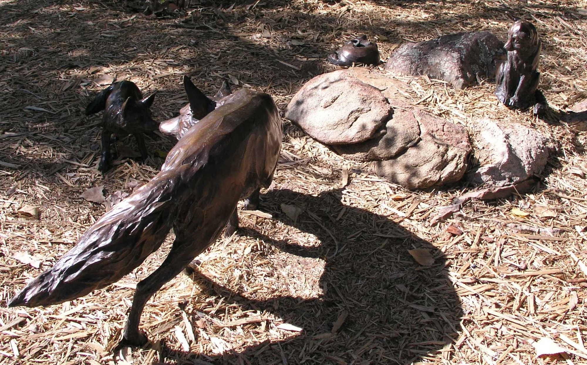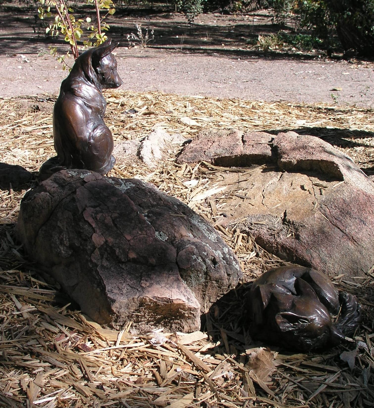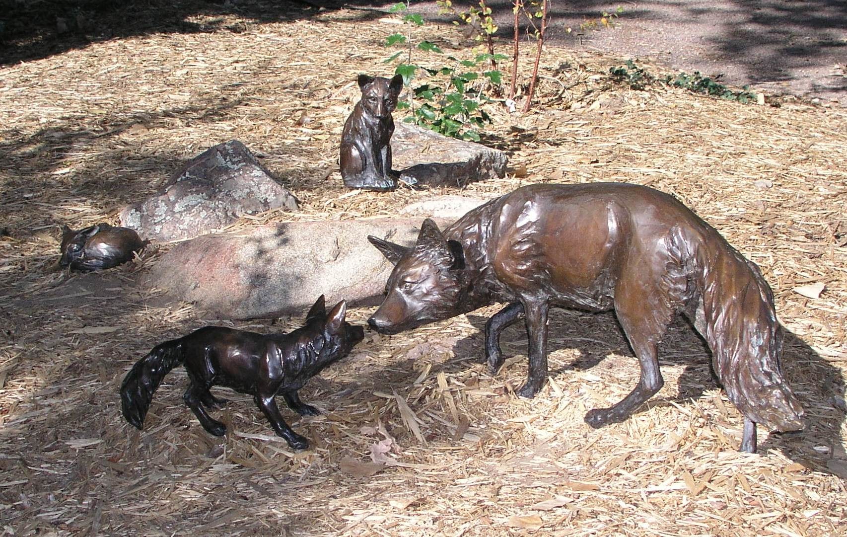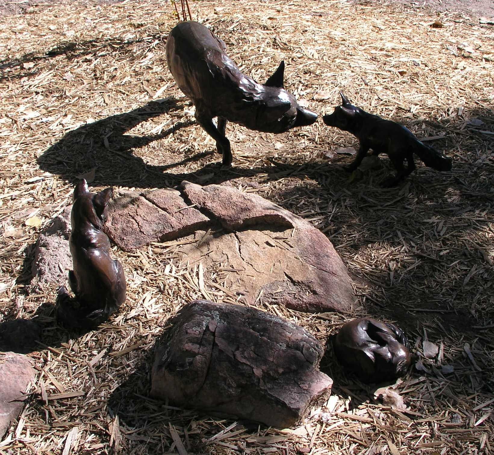 "Fox Den" by Susan Grant Raymond; bronze sculpture of mother fox and 3 pups; dark copper patina with the textured areas being darker; a) mother fox is standing with head down, sniffing nose of pup (b); b) small fox standing with head up, sniffing nose of mother (a); c) small fox sitting with tail wrapped around feet, looking towards mother; d) small fox laying down, coiled into ball with feet & tail under chin.