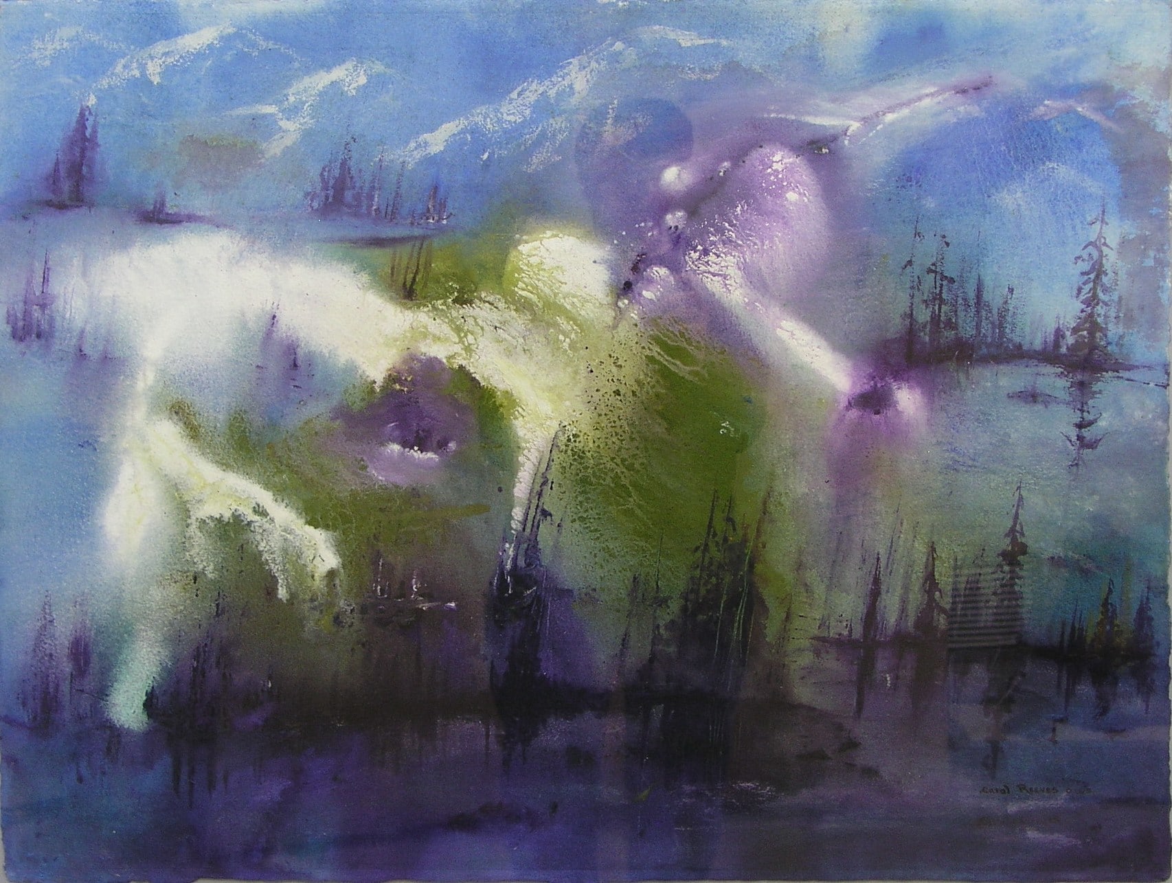 "Listen!" by Carol Reeves, 2001; mixed media painting; abstrated image of forest, mountains & water; colors in shades of blue, purple, green, white & beige; media include acrylic, oil & watercolor paints; floating mounted deckled edge paper on grey mat, with white outer mat; silver quarter round metal frame; glass covering.