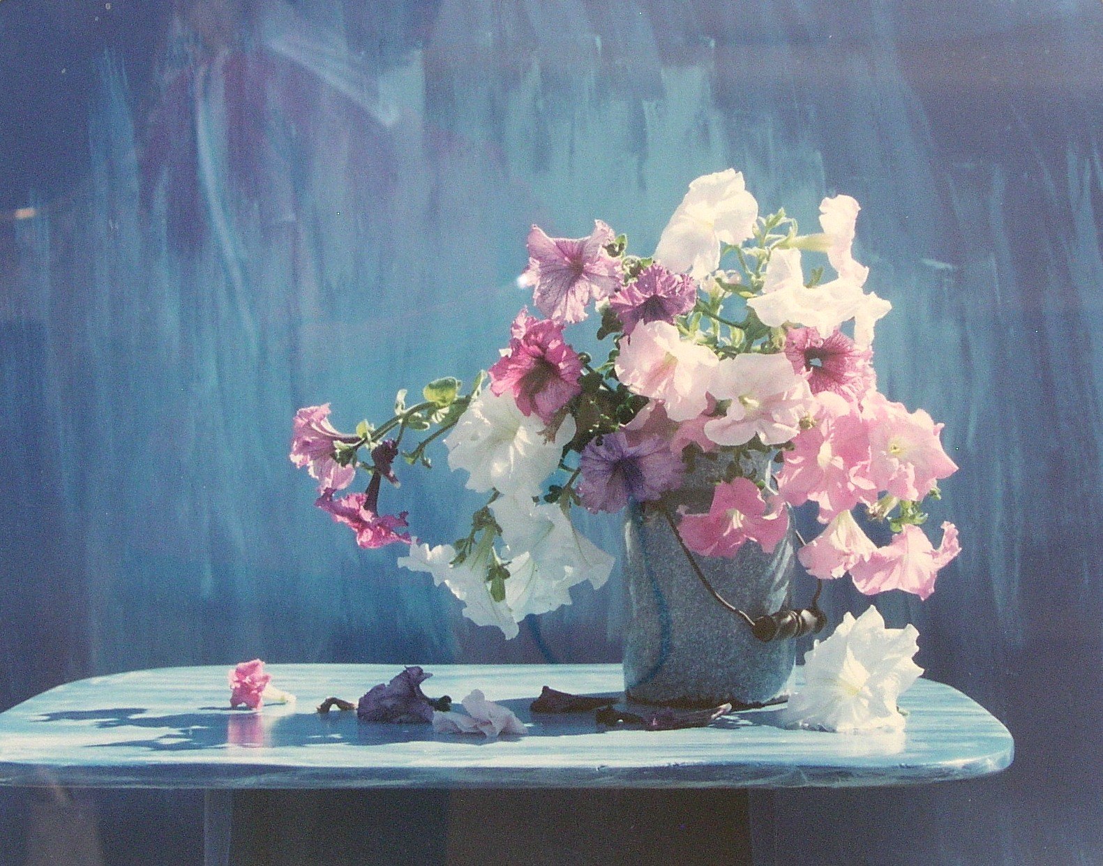 "Little Trumpets 20/50" by Art Gore, 1989. Photograph of flowers in a bucket on a table. Petunias are pink, white, and purple; table, bucket and background wall are blue. Double silouette matted in pale and darker blue. Frame is rounded wood with blue laminate. Wire hanger. Plexiglass (?) face.