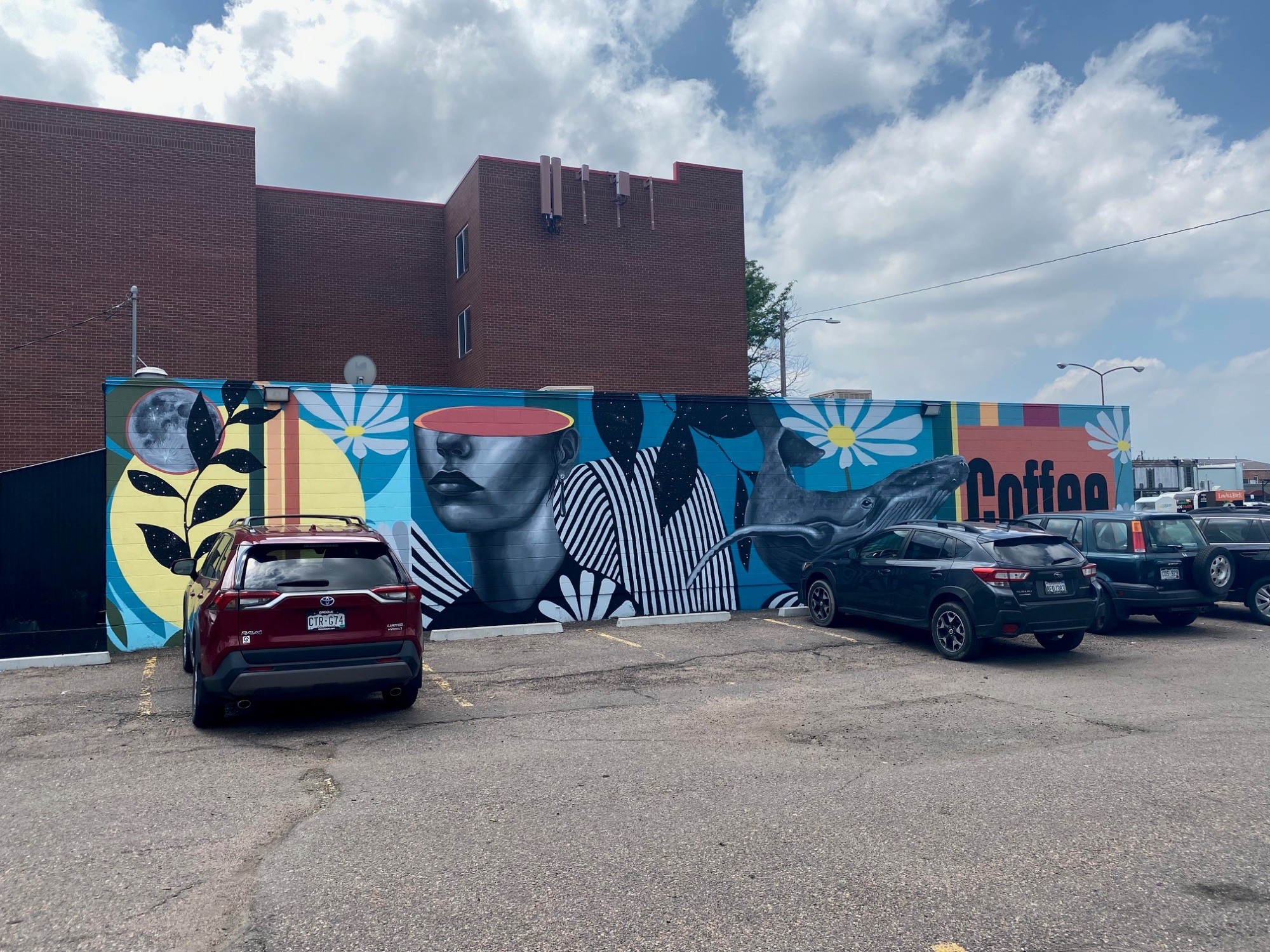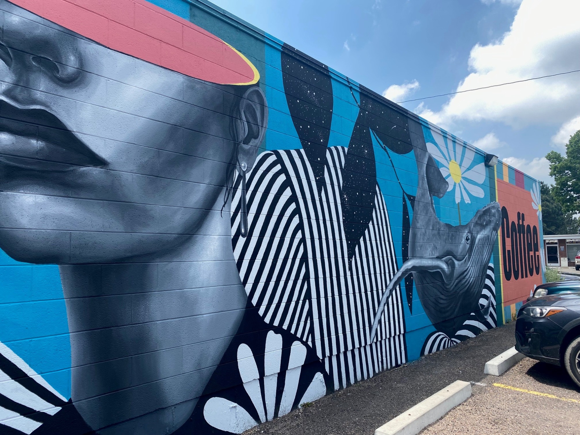 "Morning Waves" by KOCOCOLLAB (Aiko Szymczak & Corrine Trujillo). Located on the north wall of Devil's Cup Coffee, located at 5624 S. Prince St., Littleton. Image faces the parking lot to the north side of building. 40' wide by 11' high. Painted using latex paint and spray paint.