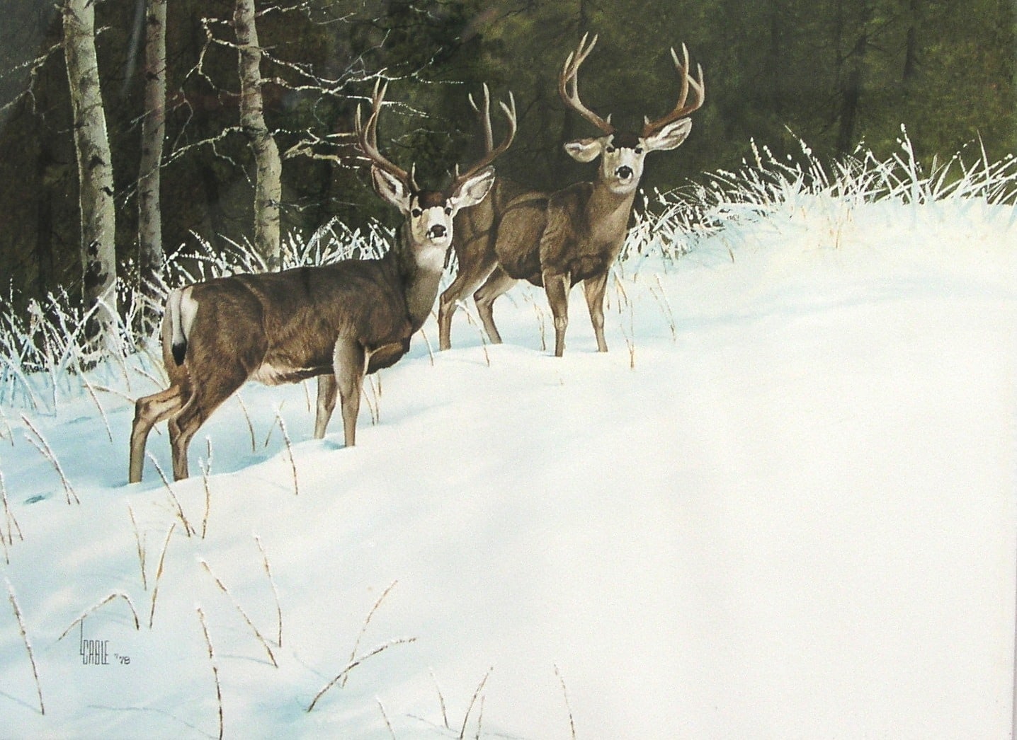 Watercolor entitled "Mule Deer" showing two deer in snow in front of a wooded area. Framed and matted in a double frame of weathered pine wood. Artist's signature on lower left with date. By Lee Cable, July 1978.