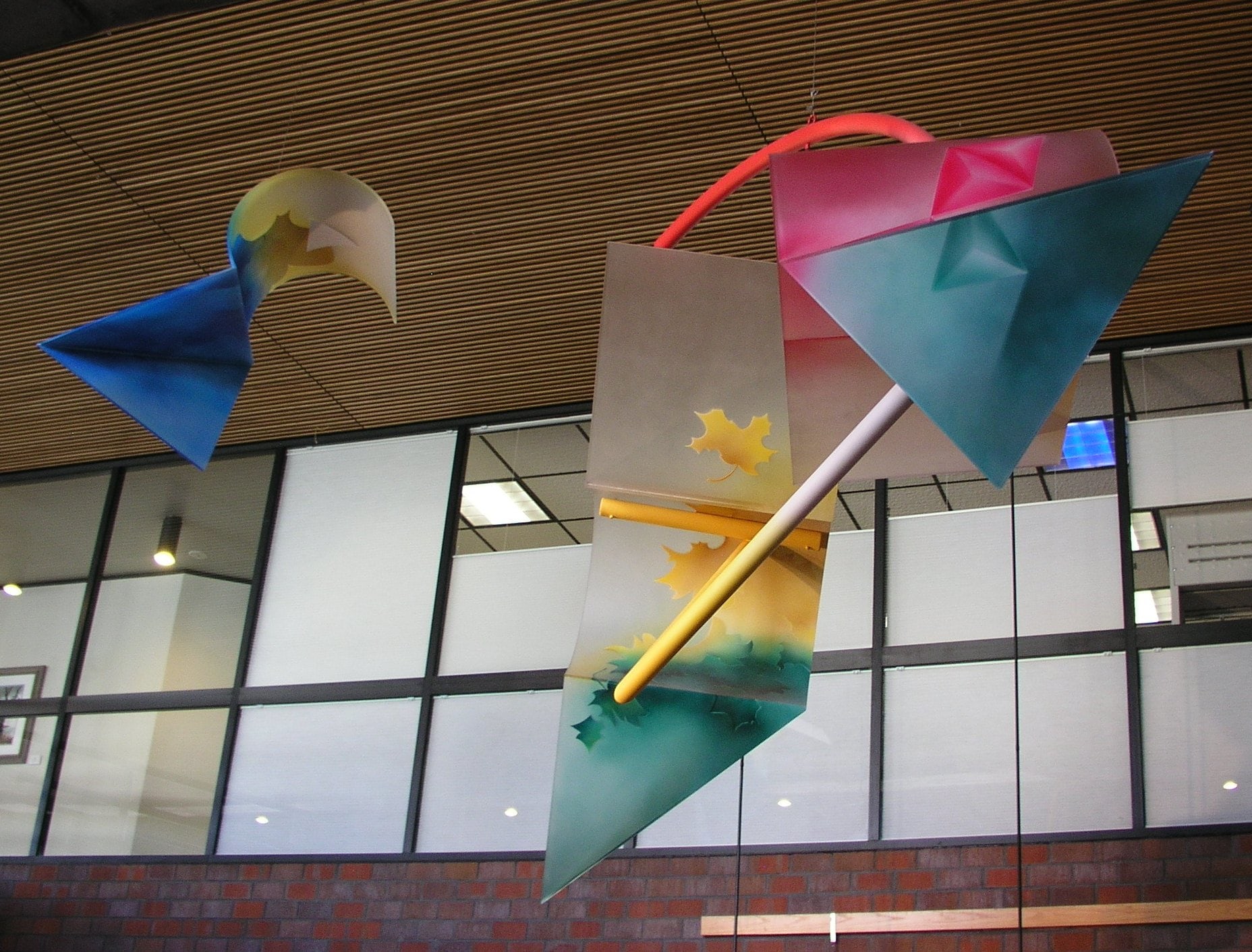 "Open Skies" by Barbara Baer, 1996; a) hanging mobile sculpture; support structure made of aluminum tube w/two 90-degree angles; 2 sections/arms are straight, the 3rd has long slight curve; tube painted yellow, white & red; mounted on 2 of the tubes are 2 pieces of frosted Plexiglas, cut in rectangular shapes & consisting of flat planes, semi-circular bends & triangular folds; Plexiglas is airbrushed in yellows, teals, & reds; opaque leaf & geometric patterns painted onto Plexiglas; b) single piece of rectangular frosted Plexiglas, with a semi-circular bend & triangular folds; surface airbrushed in blue & yellow, with opaque cloud forms.