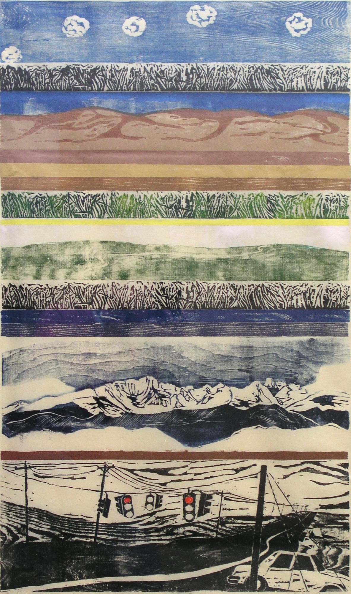 Print by Betsy Caplan titled "Road Maps Denver to Cheyenne 5/25" Map is a series of scenes arranged vertically showing various scenic views on the road. Colors are black, blues, greens and browns. Print is matted and framed in a silver-colored metal frame. Period: 1980