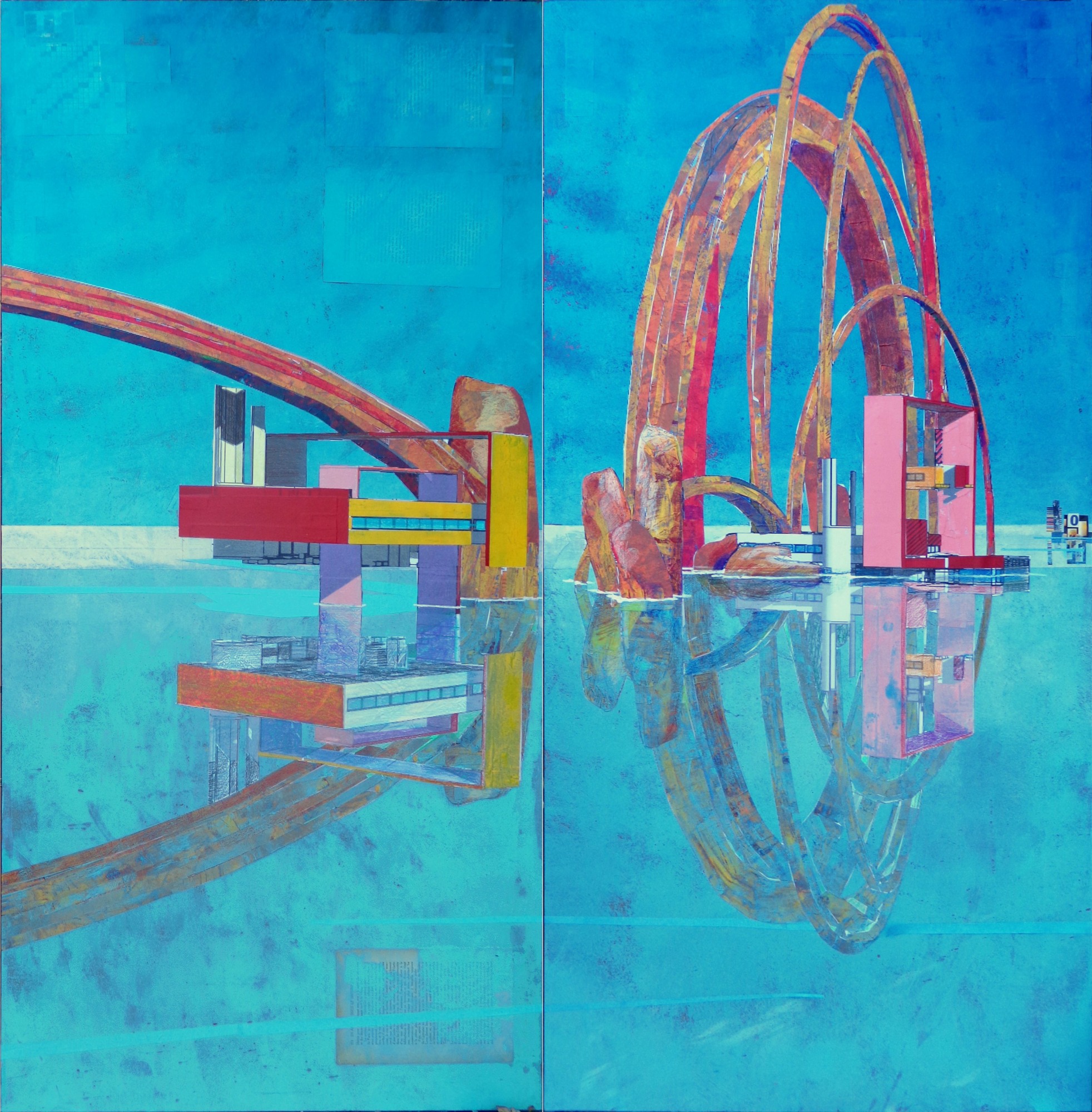 Painting; diptych; mixed media; various colors: yellow, blue, red, white; 2 rectangular panels; acrylic, collage, epoxy; two images of the sea and a structure