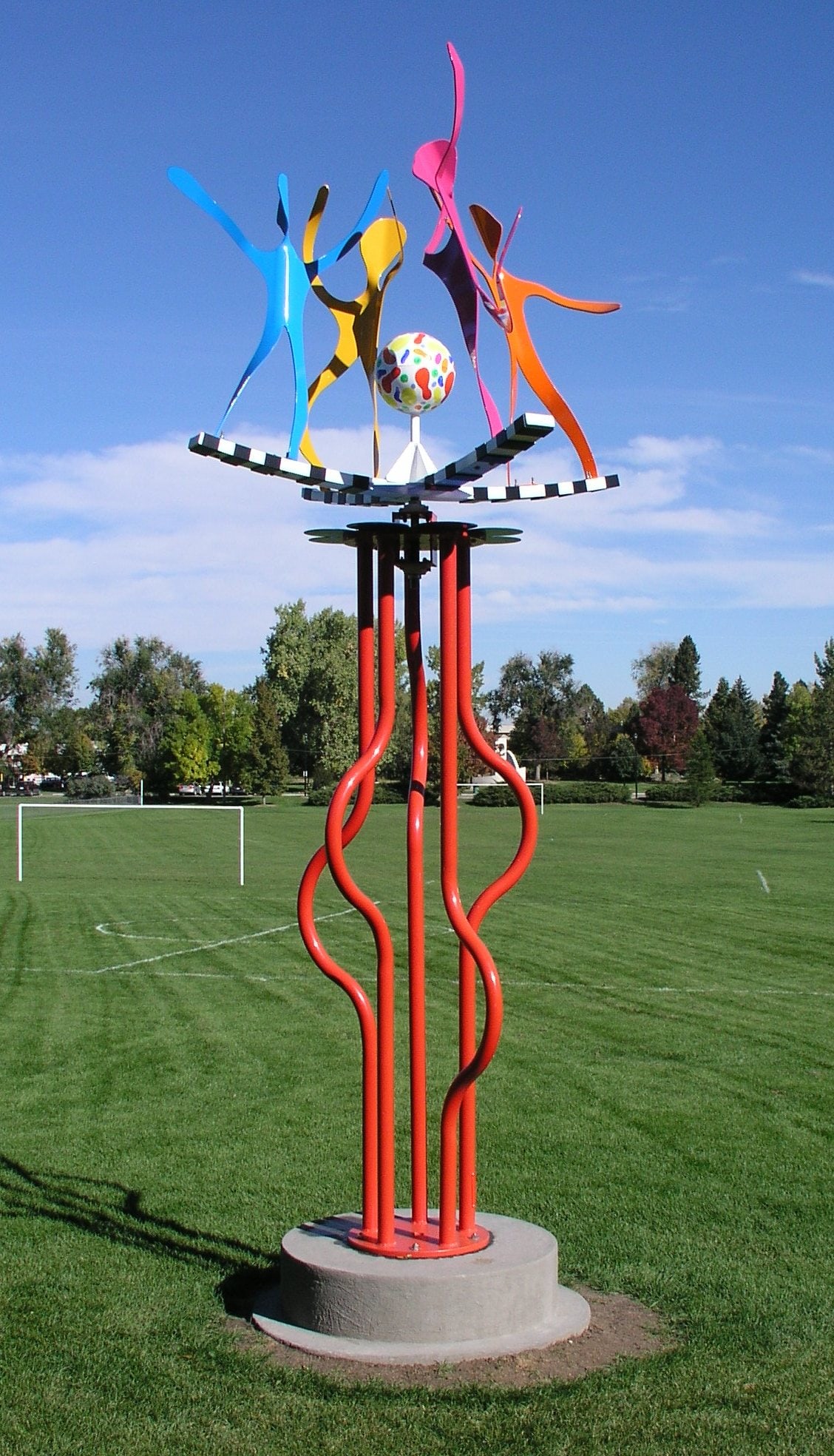 "Skip To My Lou" by Don Mitchell, 2003; large aluminum piece with multi-colored painted surface with clear powder-coated top surface; base has 5 long red round poles arranged in a circle, and are straight at top and bottom, with one slight curve on each, at different intervals; dark blue petalled "collar" at top of poles; ball bearing mechanism on top of the "collar"; 4-pronged cross is white with black stripes; prongs are rectangular in shape but are long, narrow, and are slightly bent upwards; top center of prongs has a pyramid shape with a ball in the center; ball is round with a white background with blue, red, yellow and green organic shapes; top edge of each of the four prongs has anthropomorphic (human-like) dancing figures, in orange, blue, yellow and magenta; each figure is non-descript, overall flat with curved limbs and head, each in a different dancing position.