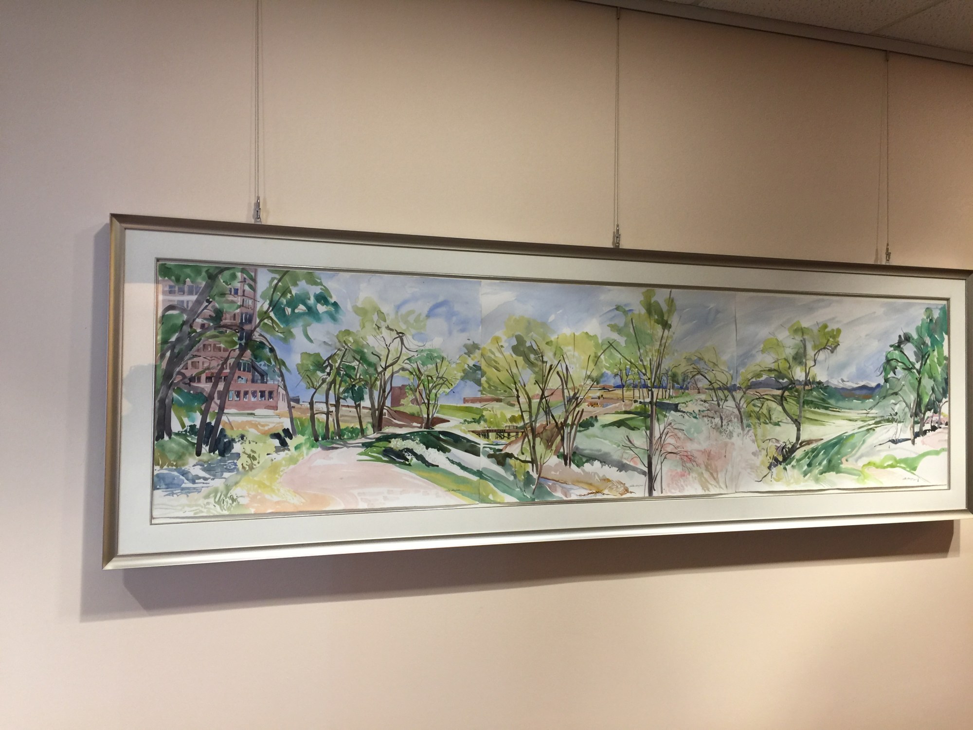 Painting, Watercolor, "The Highline Canal Triptych" by rita derjue; muted hues pastel; triptych, three watercolor sheets (panels), side my side in frame; long rectangular framed piece; watercolor paper; High Line Canal depicted where east Dry Creek Road and south of Fremont Avenue, looking south. Left panel shows a large red building on left edge, middle panel has bridge and smaller buildings in the background, right panel shows mountains on background. Each panel is signed with signature and date on right panel.