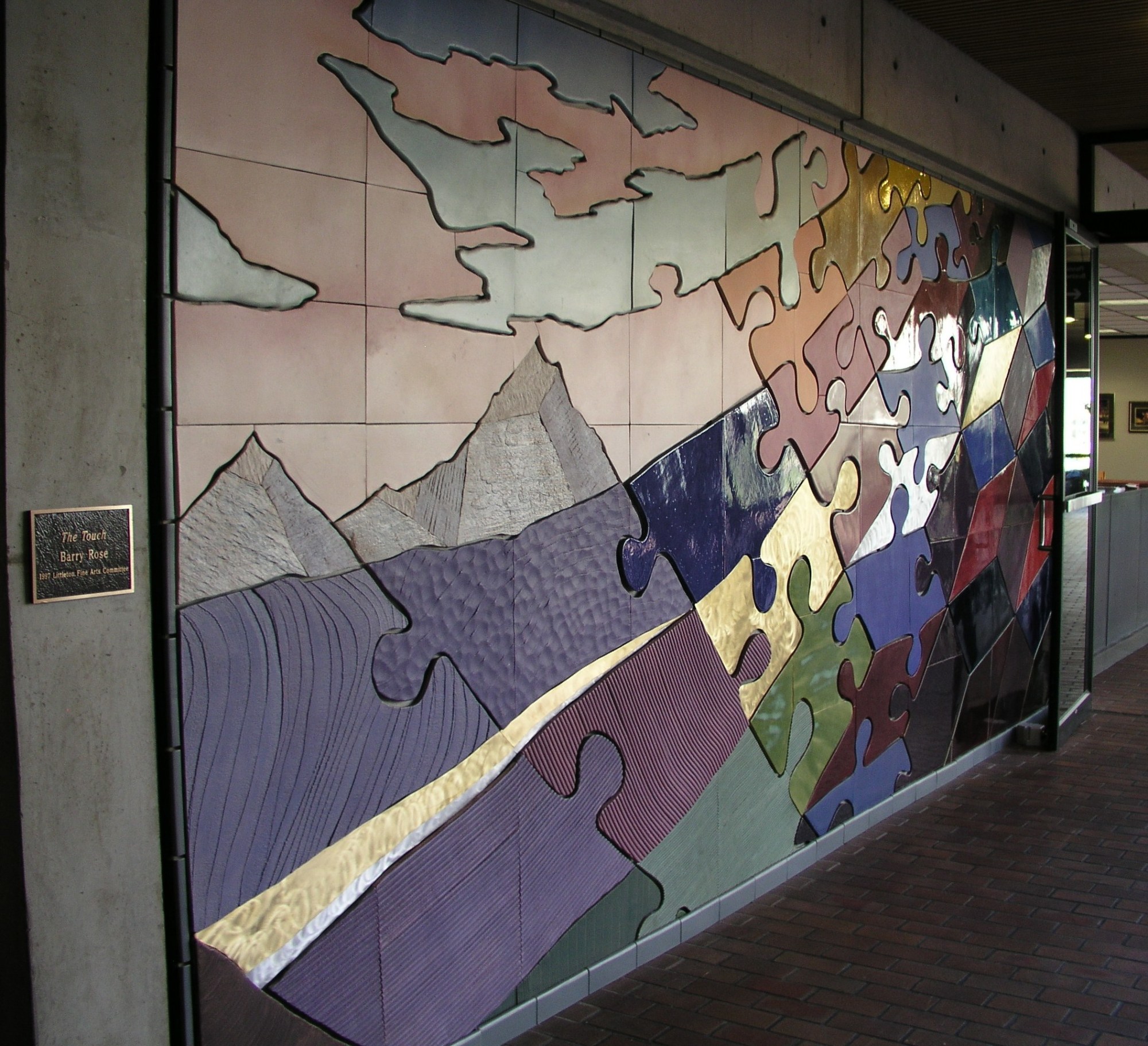 "The Touch" by Barry Rose, 1997; wall-mounted ceramic & metal tile components; large overall rectangular shape adhered to concrete wall; ceramic & polished metal pieces form parallelograms at right, which transform into interlocking puzzle pieces at the center, which transform into mountains and clouds at left and top; pieces are variously smooth, textured, matte or glossy; colors to right are darker overall; entire piece bordered with grey long, narrow bar tiles, each one separated by 1/4".